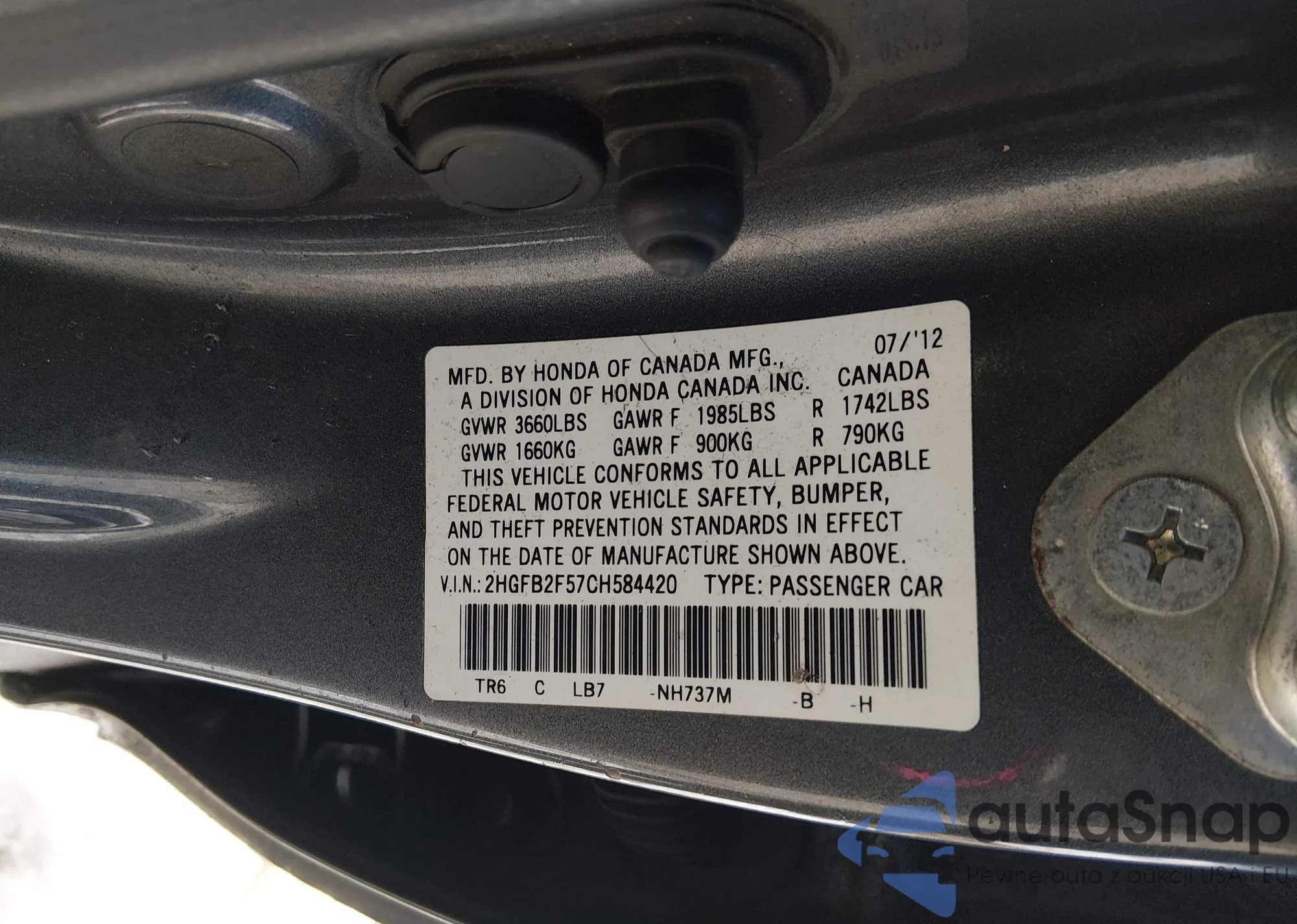 VIN: 2HGFB2F57CH584420