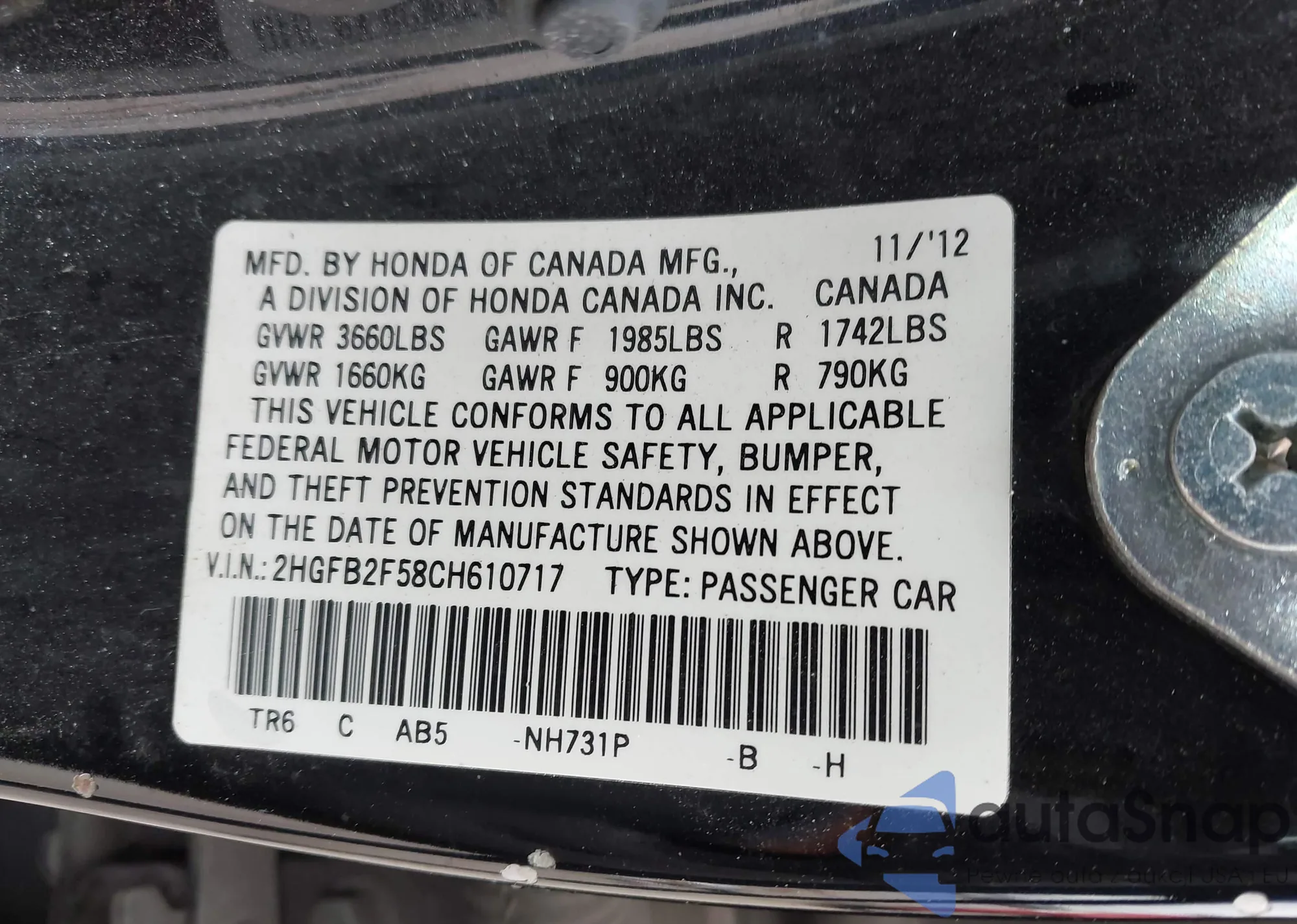 VIN: 2HGFB2F58CH610717