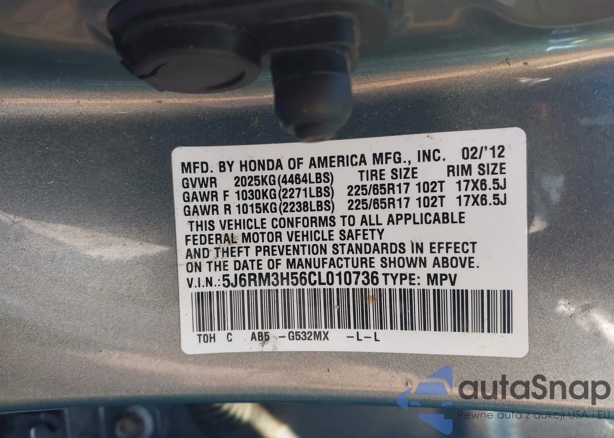 VIN: 5J6RM3H56CL010736