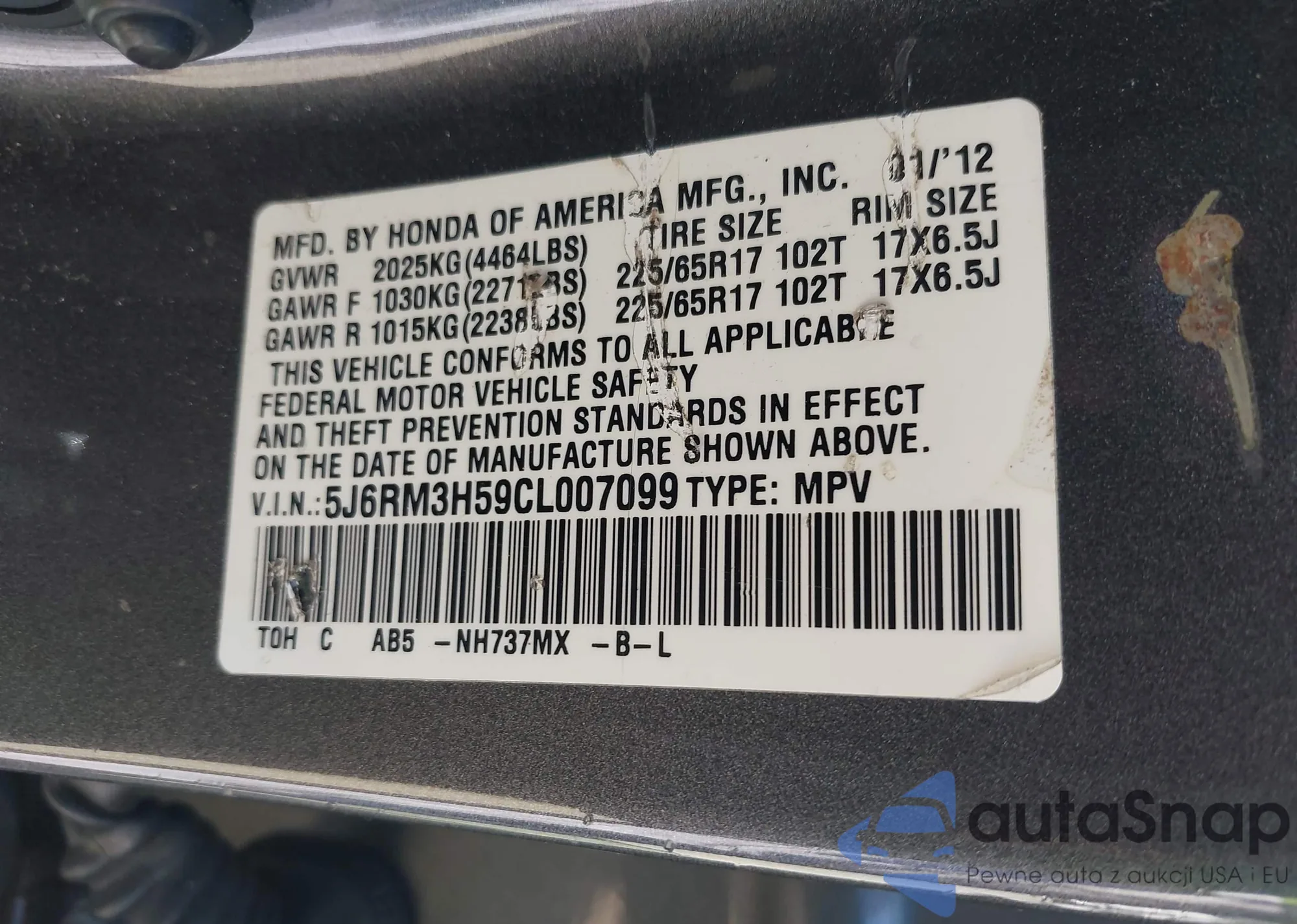 • VIN: 5J6RM3H59CL007099