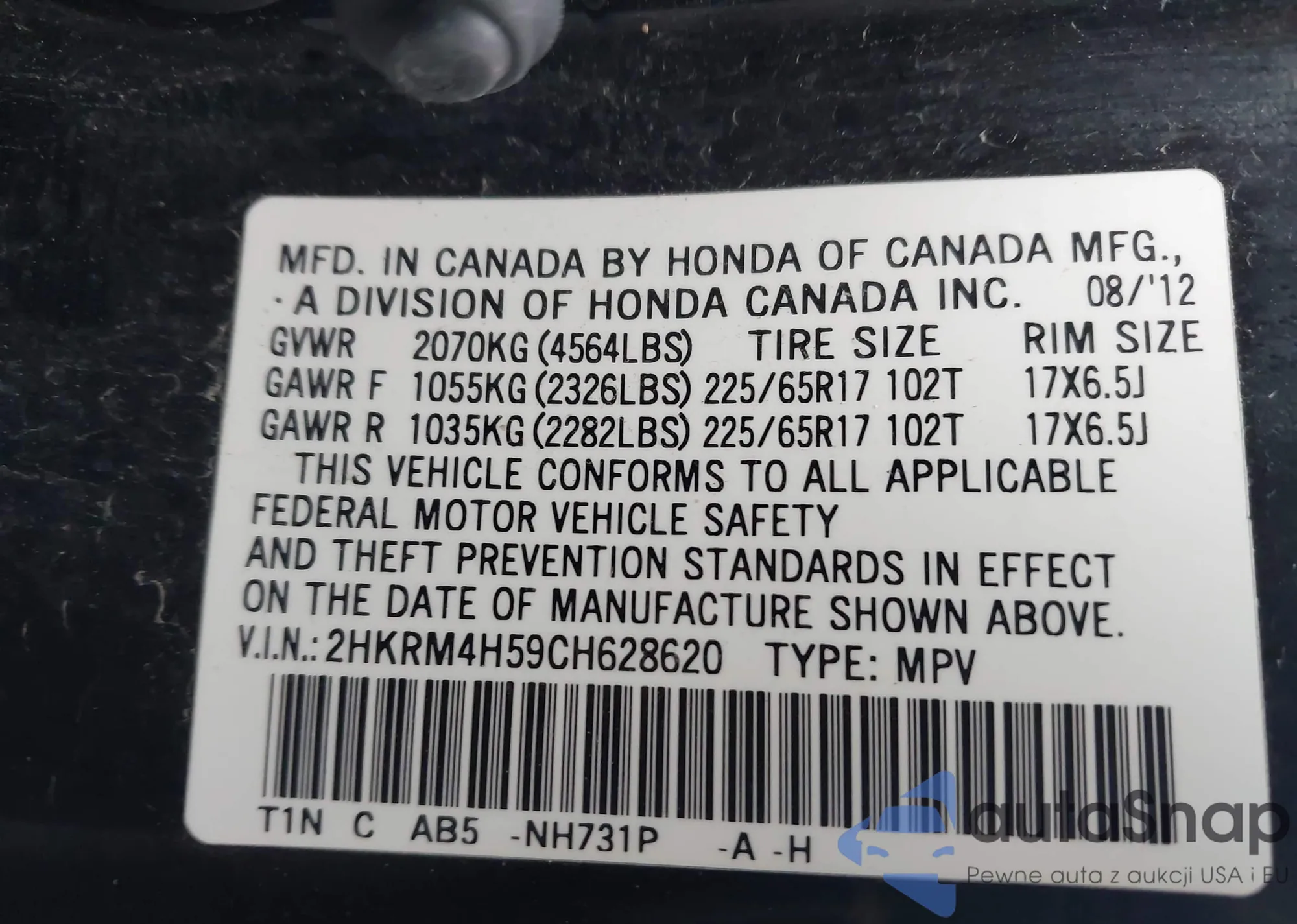 VIN: 2HKRM4H59CH628620