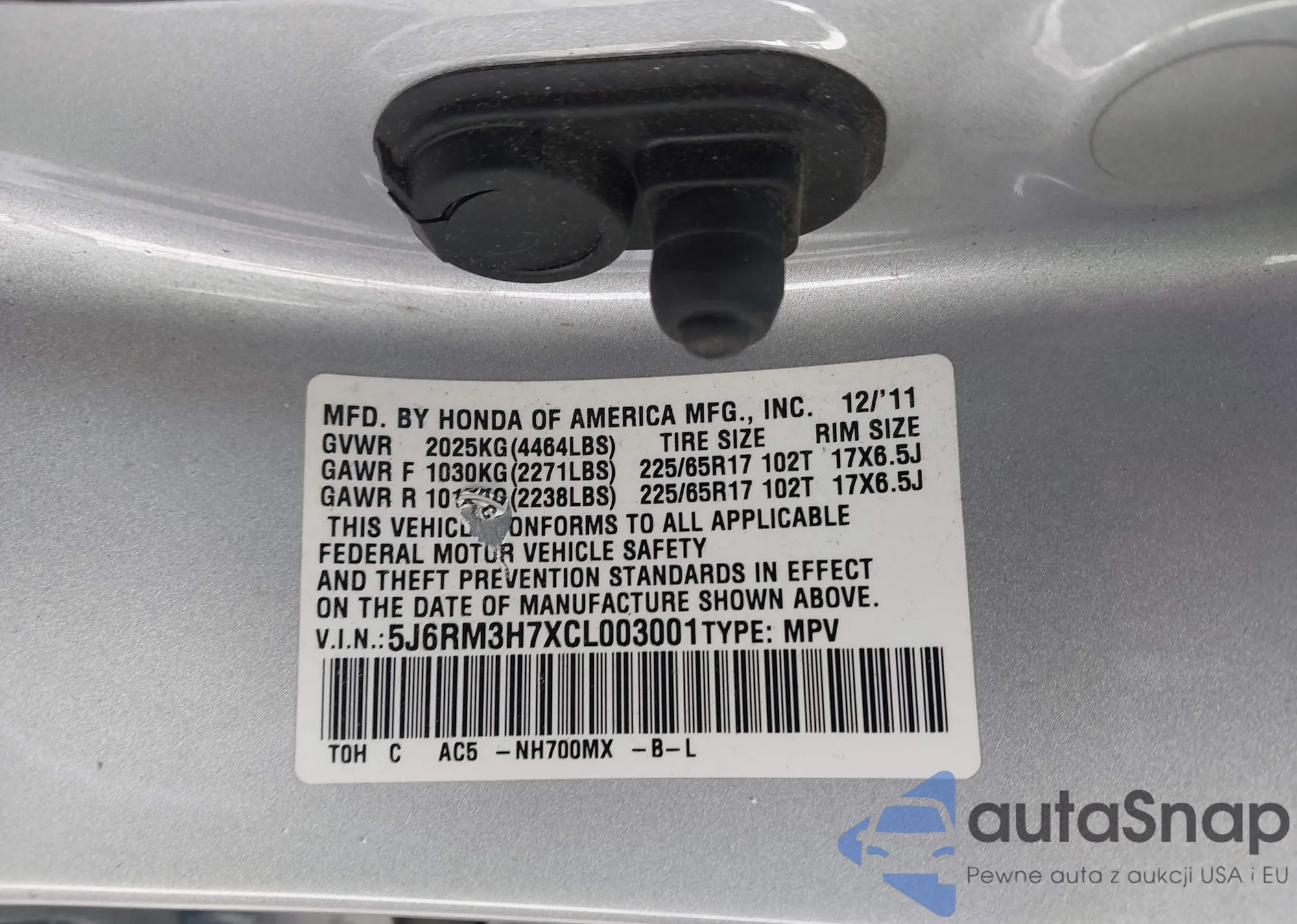 VIN: 5J6RM3H7XCL003001