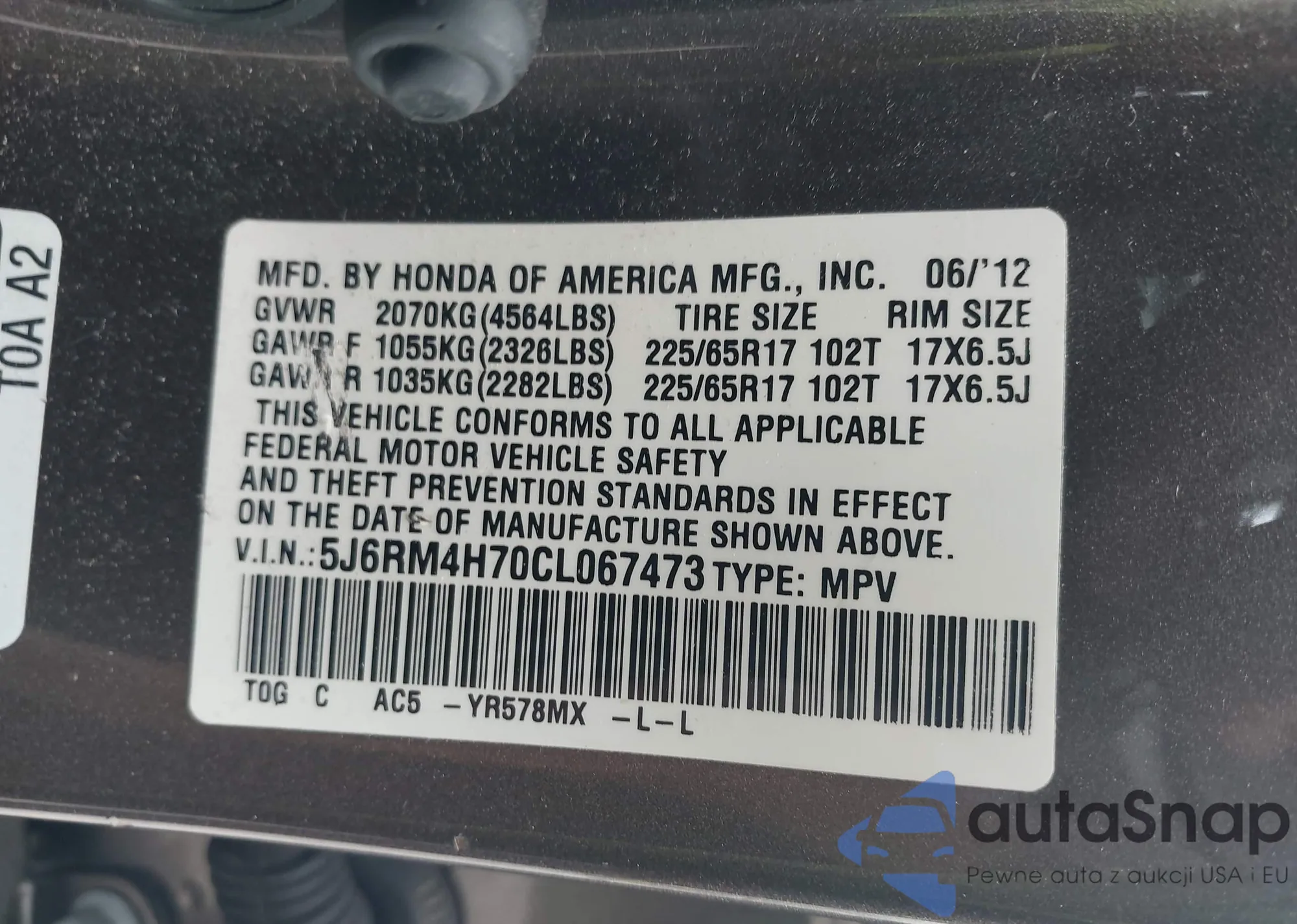 VIN: 5J6RM4H70CL067473