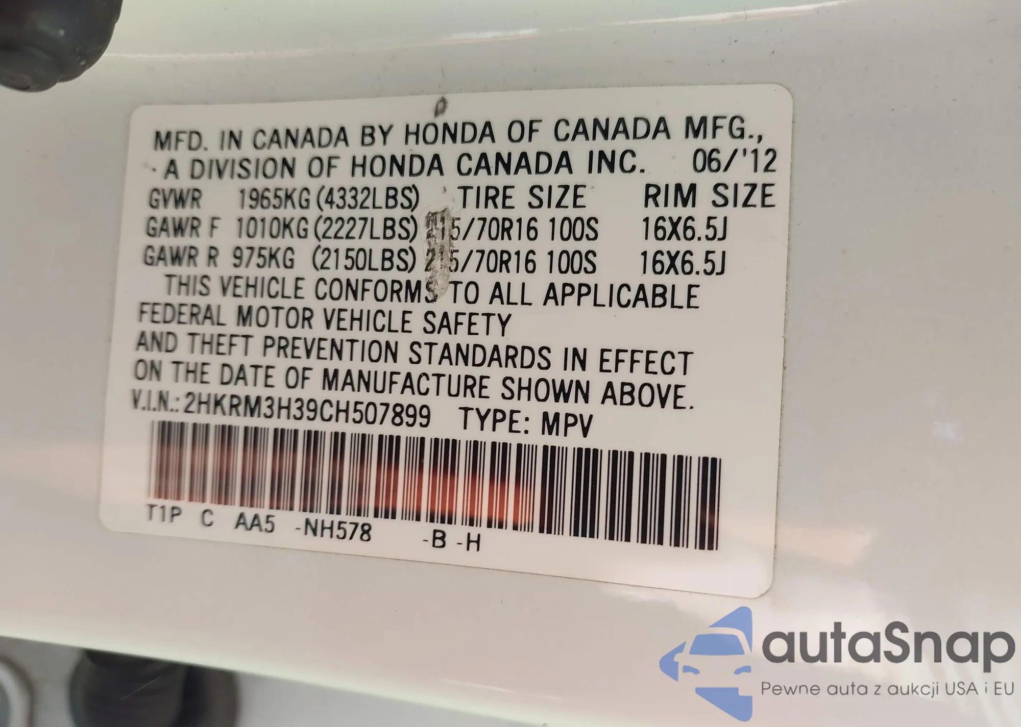 VIN: 2HKRM3H39CH507899
