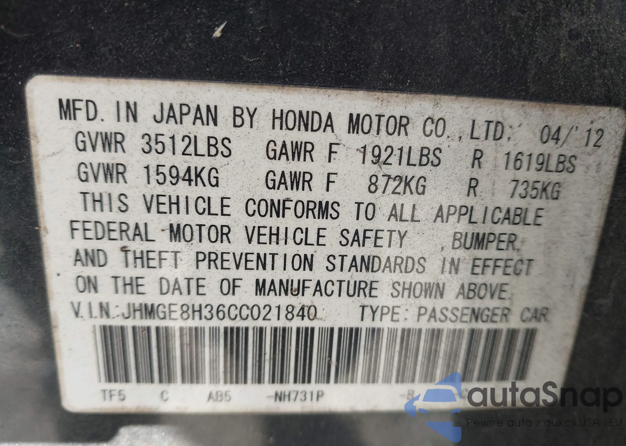 VIN: JHMGE8H36CC021840