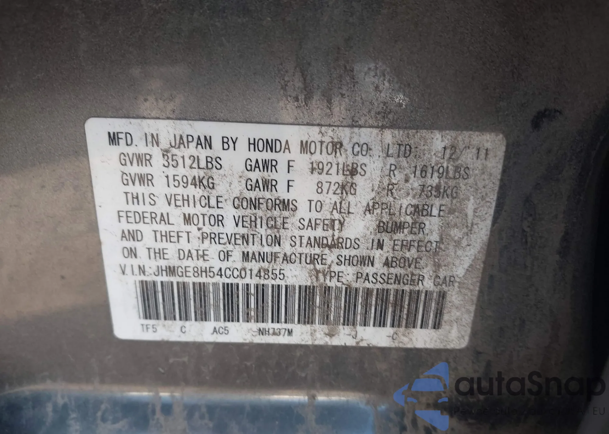 VIN: JHMGE8H54CC014855