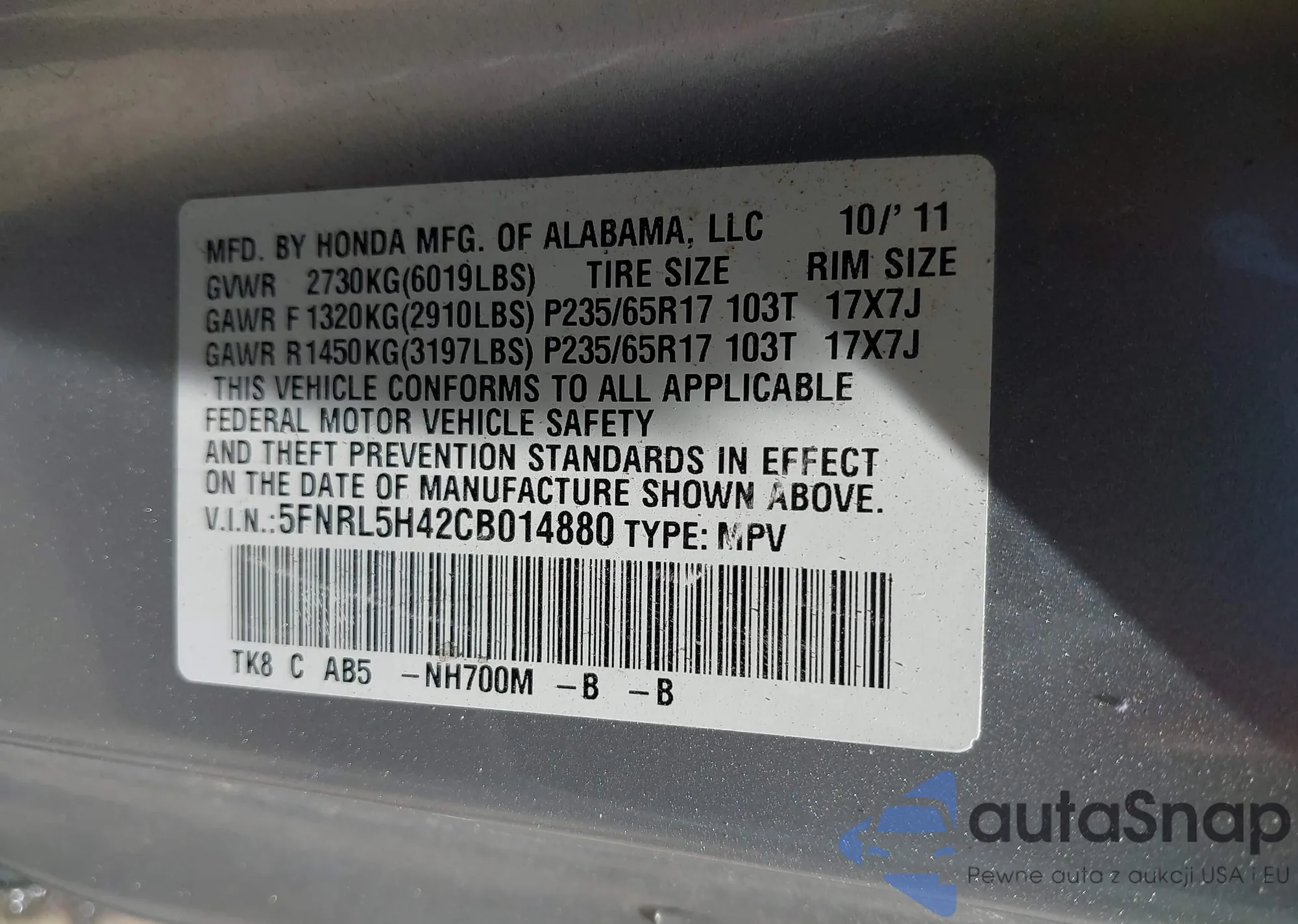 • VIN: 5FNRL5H42CB014880