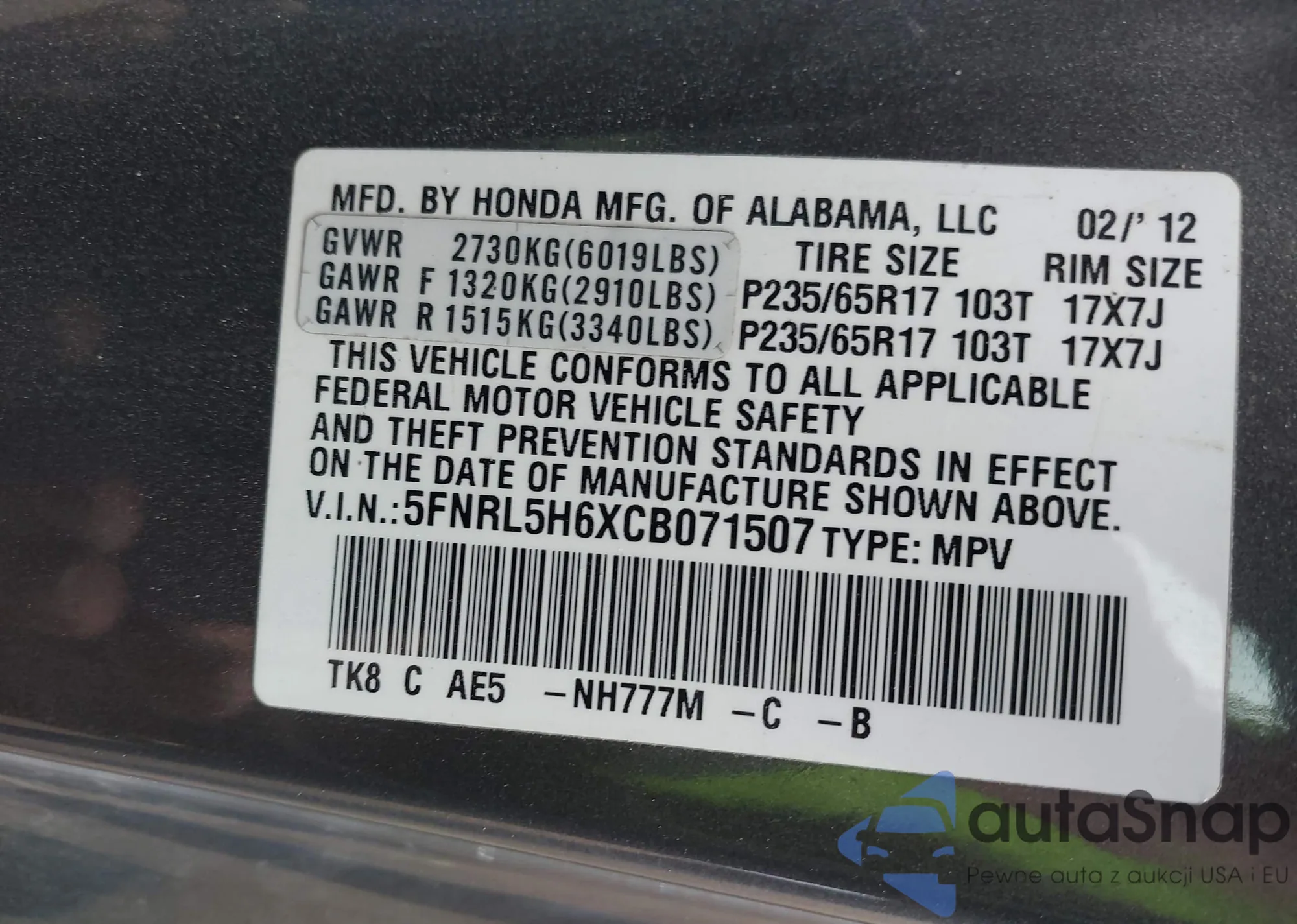VIN: 5FNRL5H6XCB071507