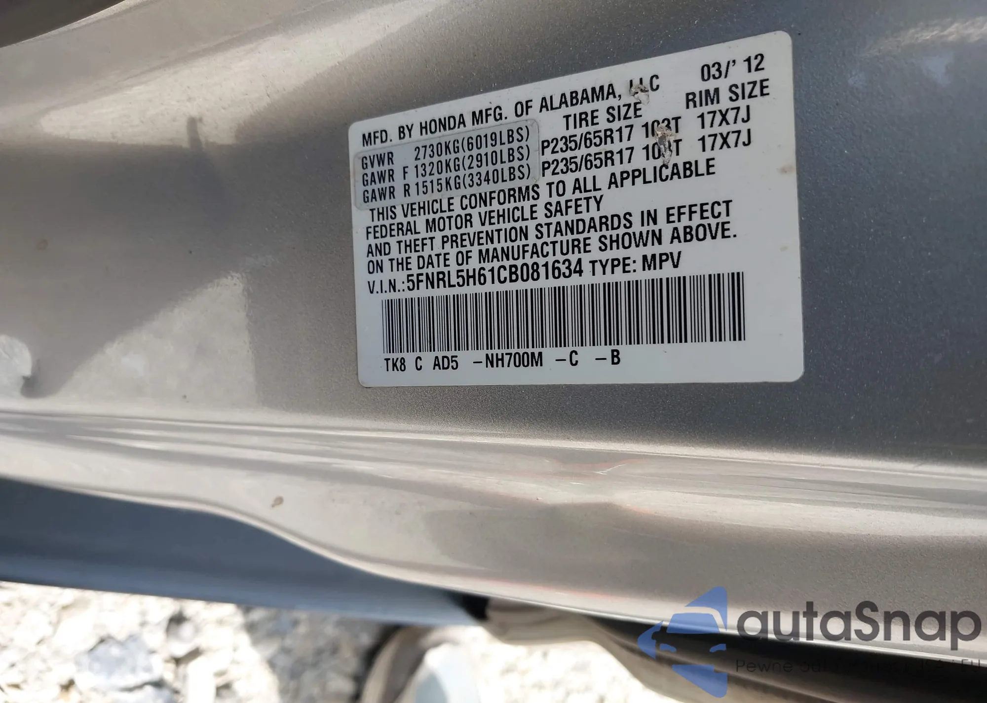 VIN: 5FNRL5H61CB081634