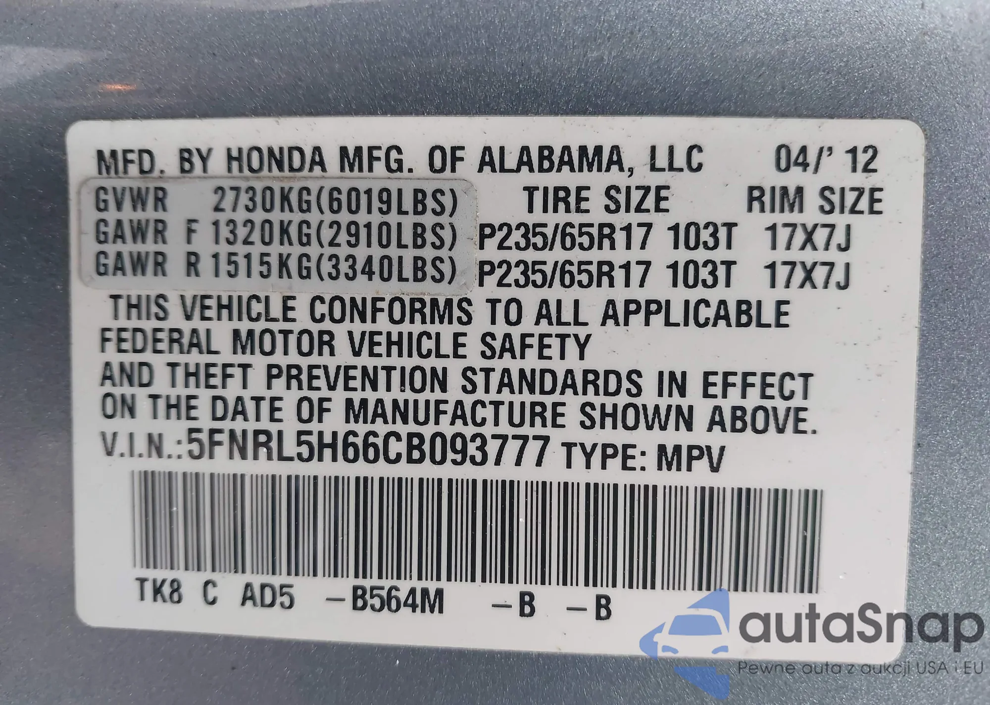 VIN: 5FNRL5H66CB093777