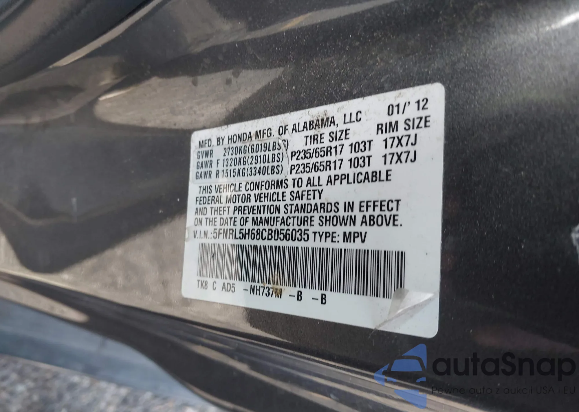 • VIN: 5FNRL5H68CB056035