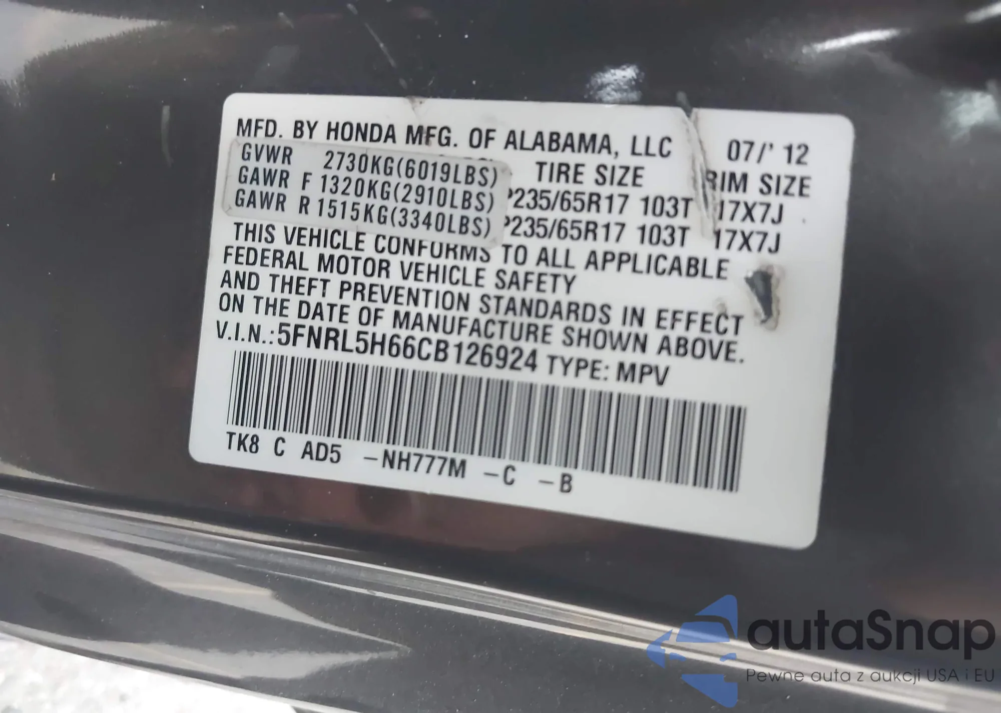 • VIN: 5FNRL5H66CB126924