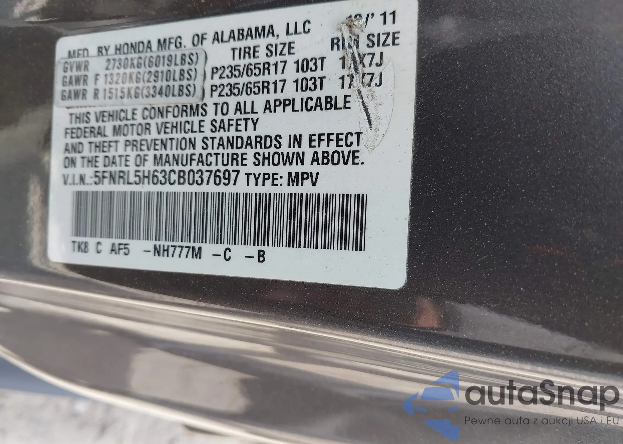 VIN: 5FNRL5H63CB037697