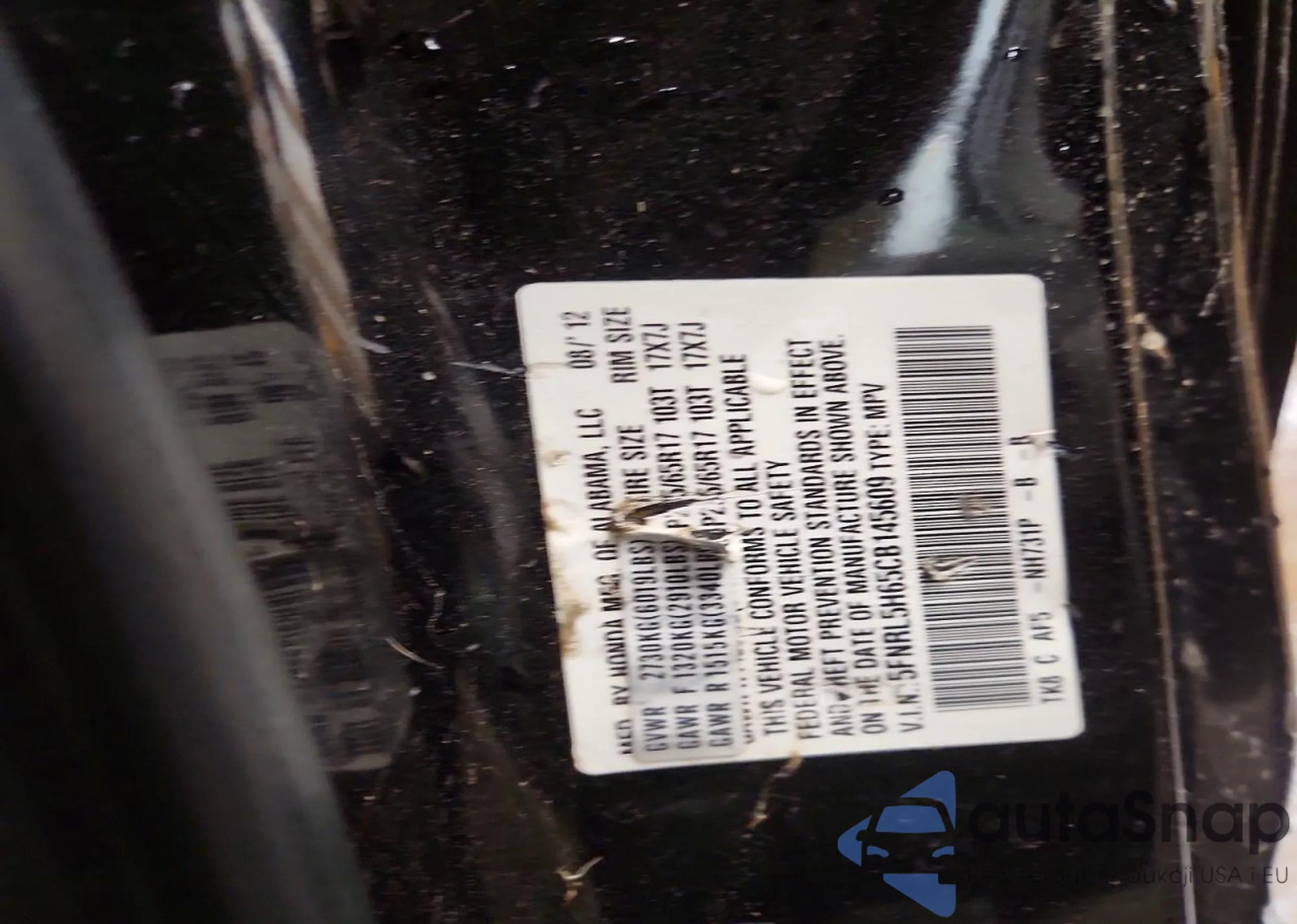 The car Honda Odyssey 2012 (VIN 5FNRL5H65CB145609) has documents that prevent registration. Export and registration may be difficult. Contact AutaSnap experts to find alternatives.