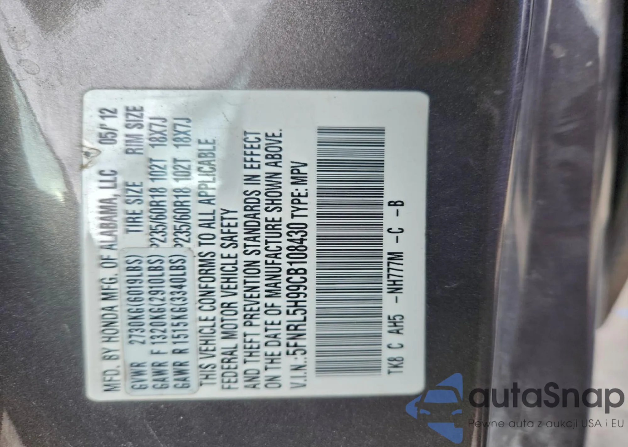 The car Honda Odyssey 2012 (VIN 5FNRL5H99CB108430) is sold by an unverified seller. We recommend checking the Carfax report and confirming registration possibilities before purchase.