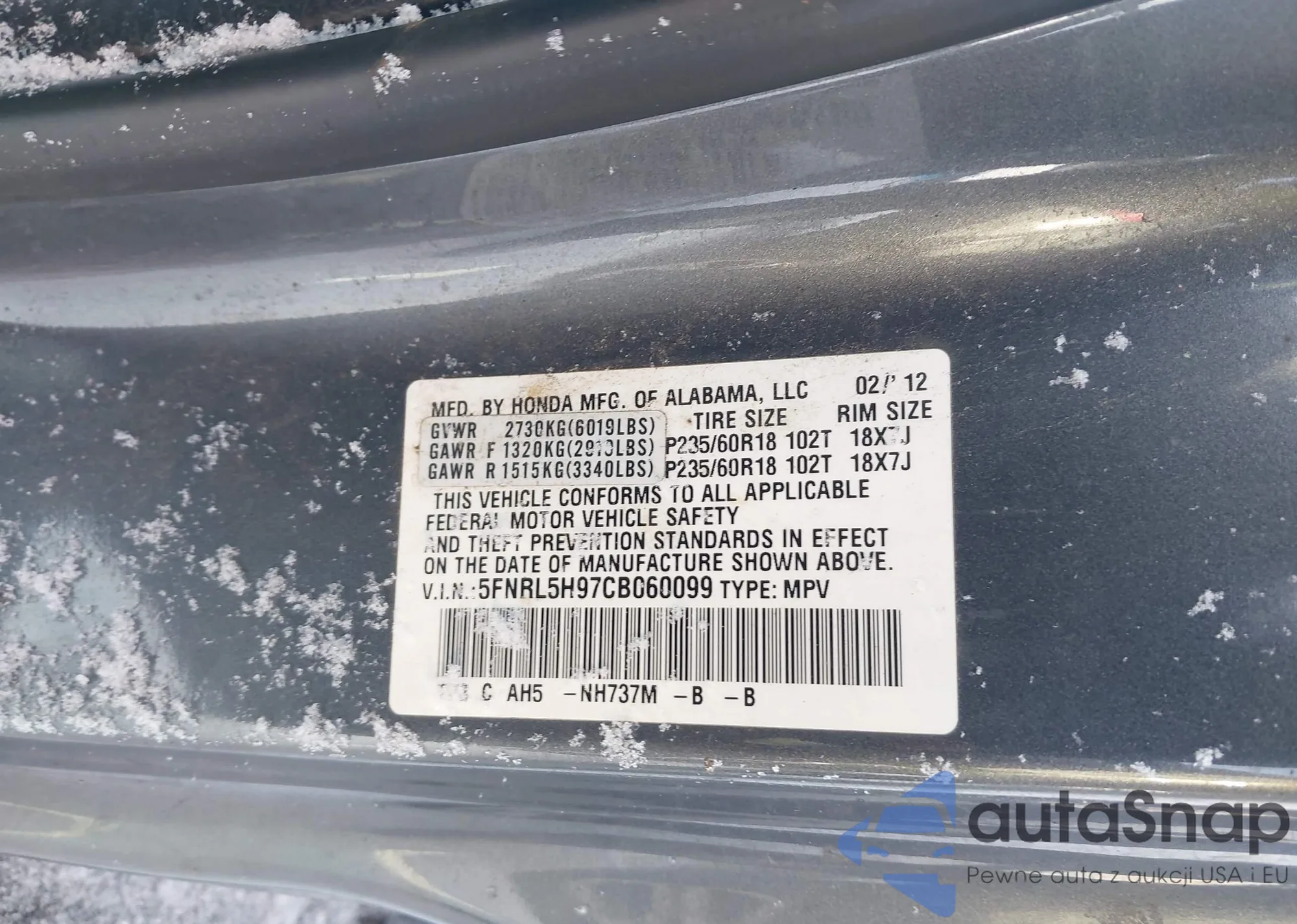 The car Honda Odyssey 2012 (VIN 5FNRL5H97CB060099) has not been auctioned before. The documents are clean, and the mileage matches or is below the market average. Sold by an insurance company – we recommend purchase. Delivery to the port will take approx. 6–8 weeks.