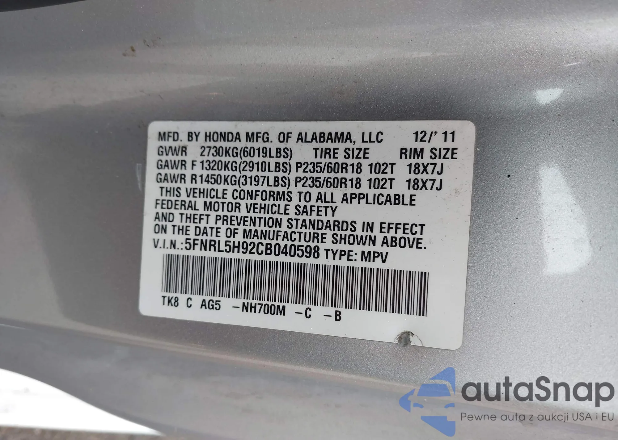 • VIN: 5FNRL5H92CB040598