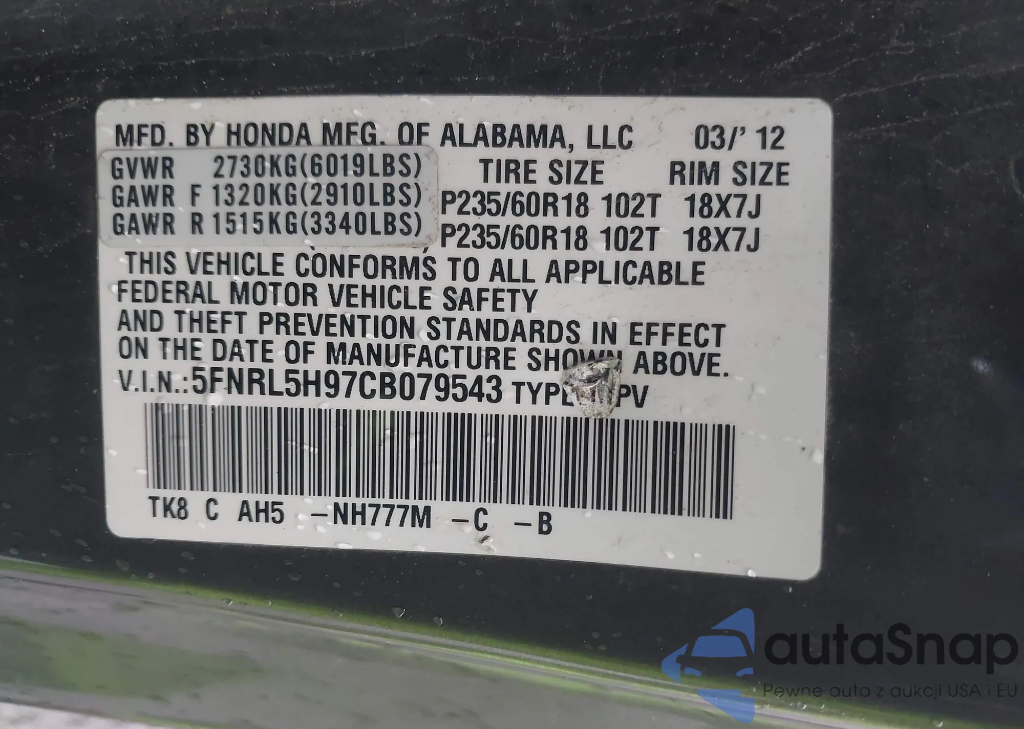 VIN: 5FNRL5H97CB079543