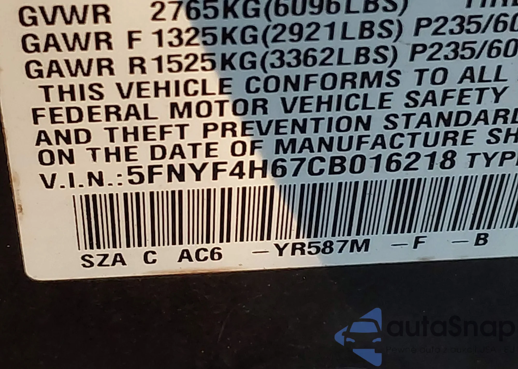 VIN: 5FNYF4H67CB016218