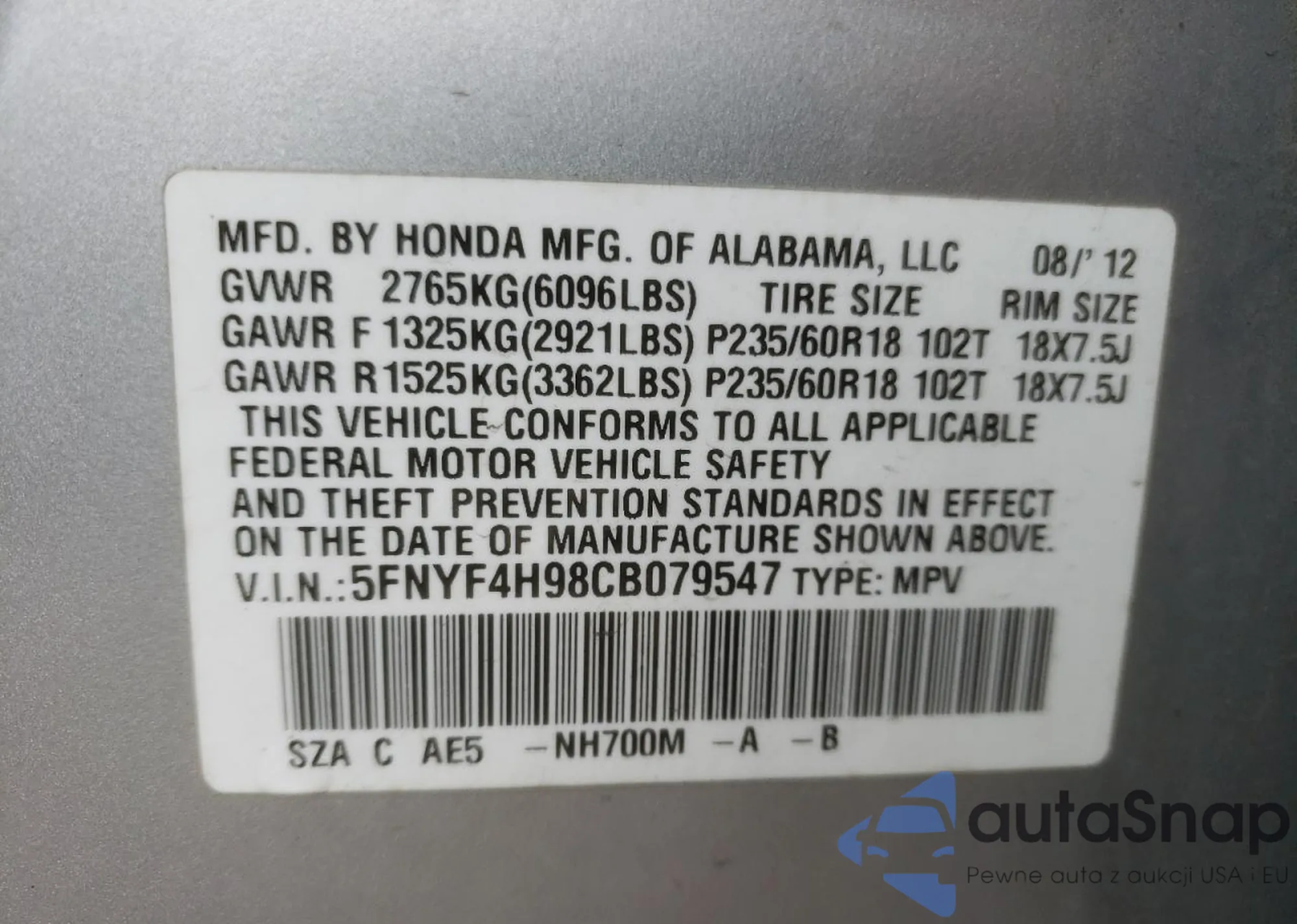 VIN: 5FNYF4H98CB079547
