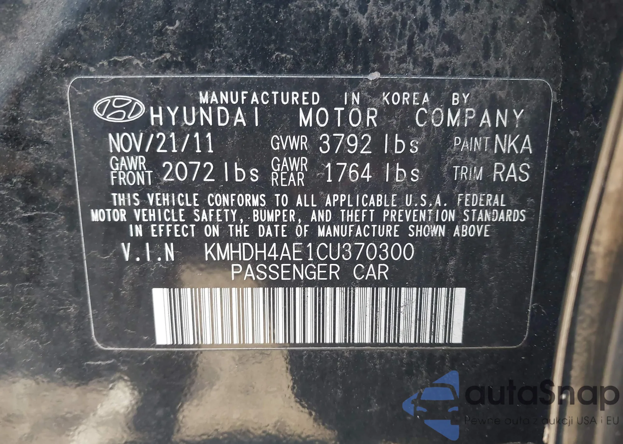 VIN: KMHDH4AE1C4370300