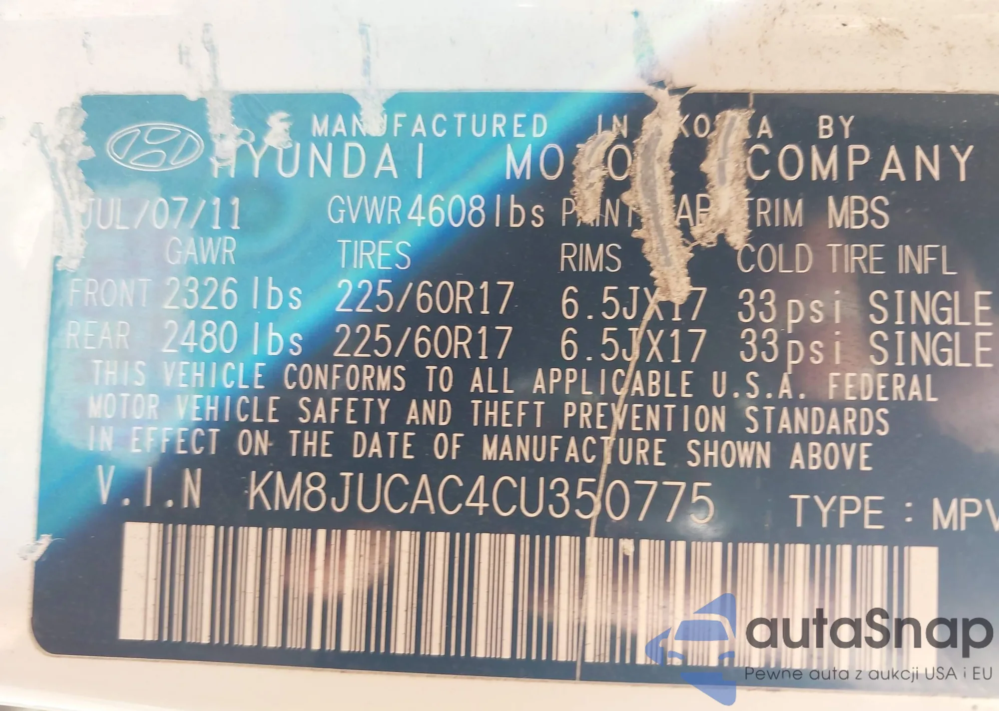 The car Hyundai Tucson 2012 (VIN KM8JUCAC4CU350775) has not been auctioned before. The documents are clean, and the mileage matches or is below the market average. Sold by an insurance company – we recommend purchase. Delivery to the port will take approx. 6–8 weeks.