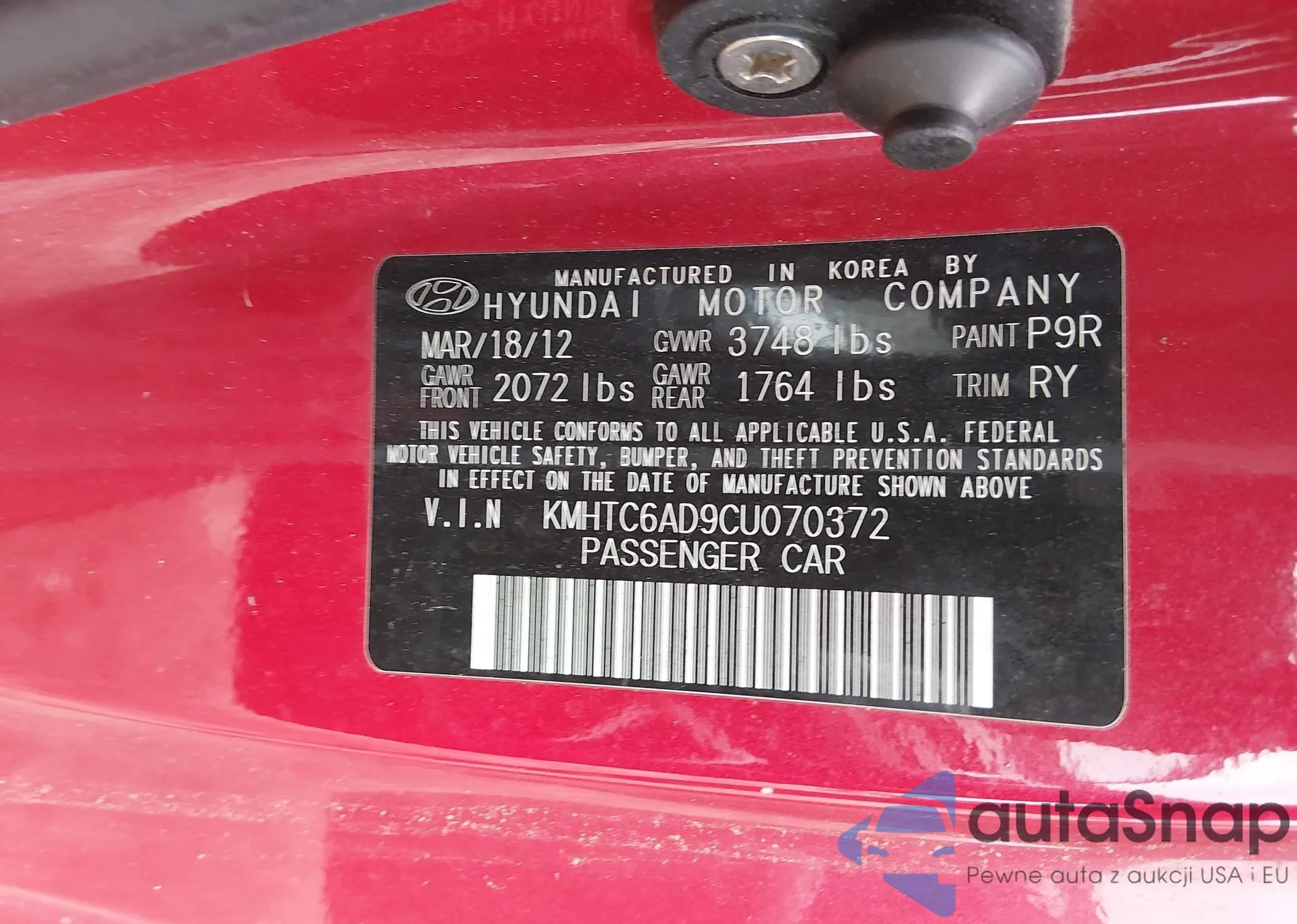 The car Hyundai Veloster 2012 (VIN KMHTC6AD9CU070372) is sold by an unverified seller. We recommend checking the Carfax report and confirming registration possibilities before purchase.