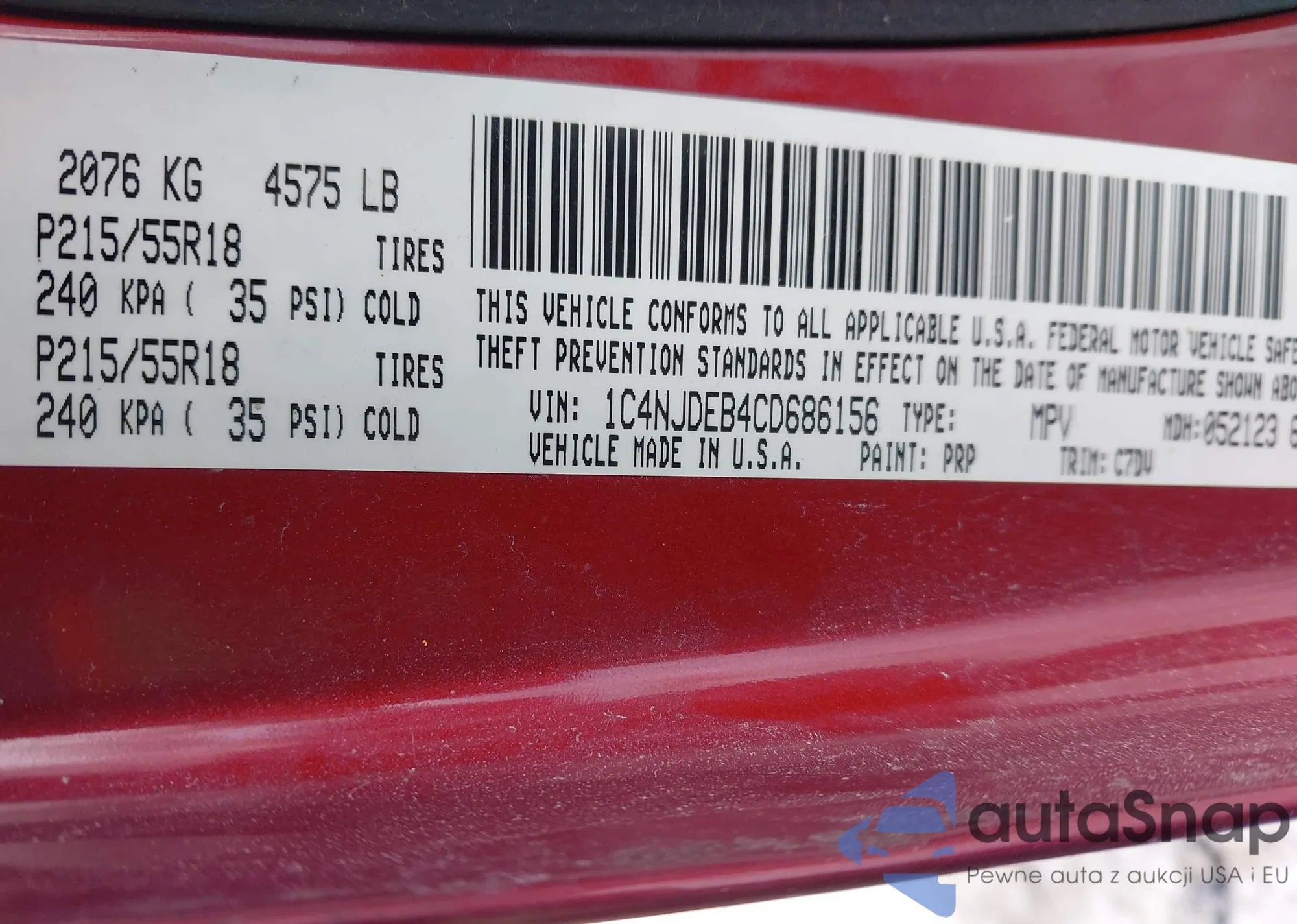 The car Jeep Compass 2012 (VIN 1C4NJDEB4CD686156) is sold by an unverified seller. We recommend checking the Carfax report and confirming registration possibilities before purchase.