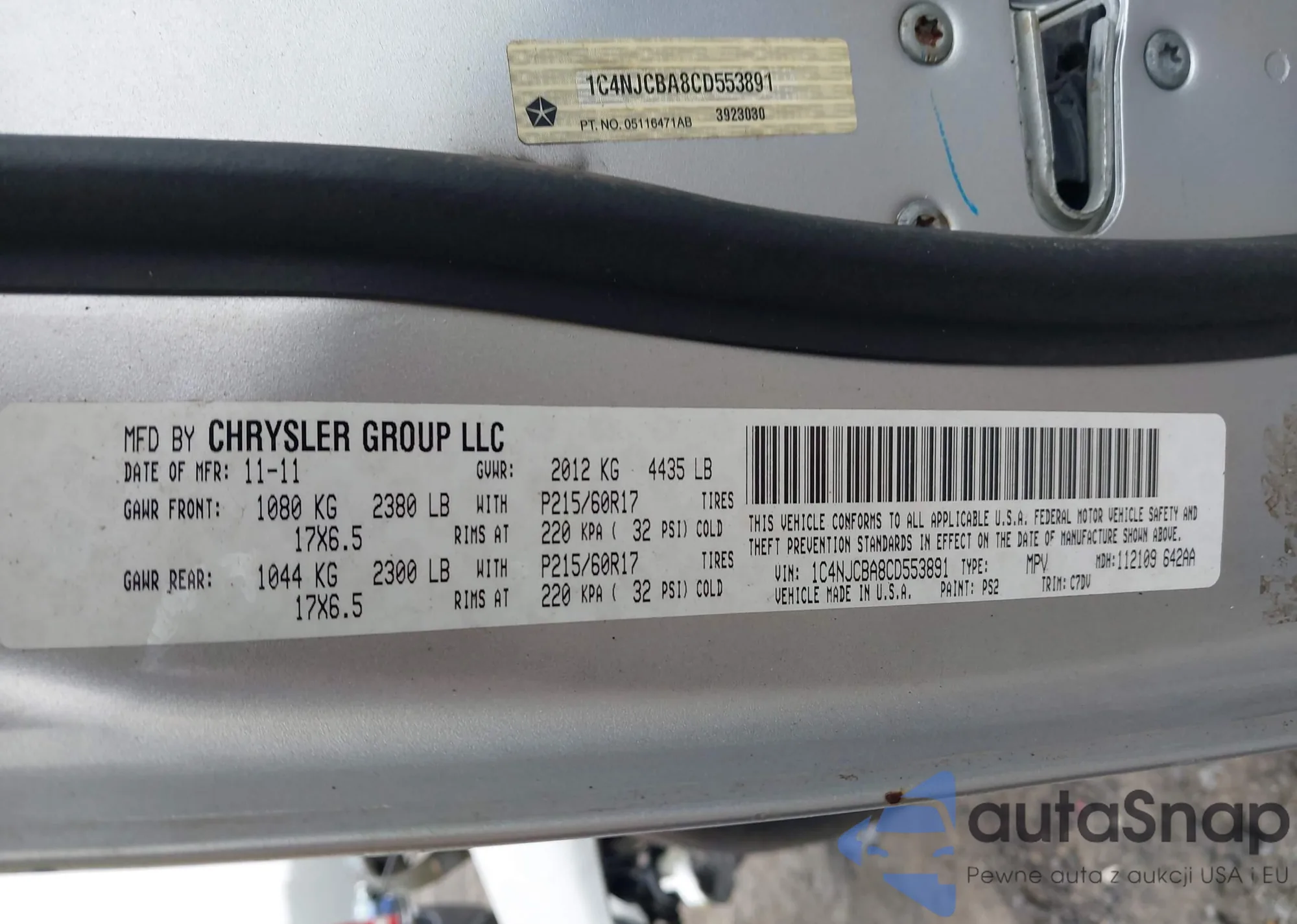 The car Jeep Compass 2012 (VIN 1C4NJCBA8CD553891) has not been auctioned before. The documents are clean, and the mileage matches or is below the market average. Sold by an insurance company – we recommend purchase. Delivery to the port will take approx. 6–8 weeks.