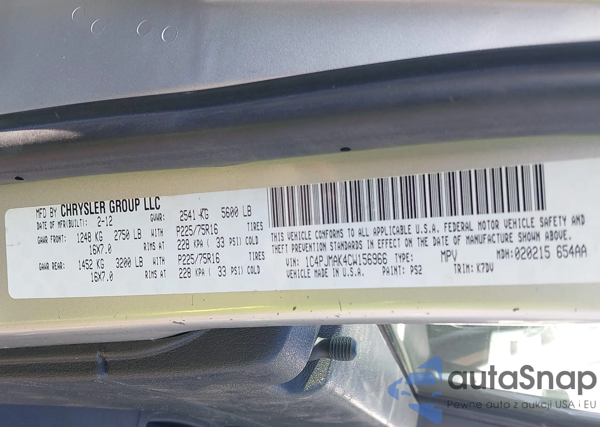 The car Jeep Liberty (North America) 2012 (VIN 1C4PJMAK4CW156966) has not been auctioned before. The documents are clean, and the mileage matches or is below the market average. Sold by an insurance company – we recommend purchase. Delivery to the port will take approx. 6–8 weeks.