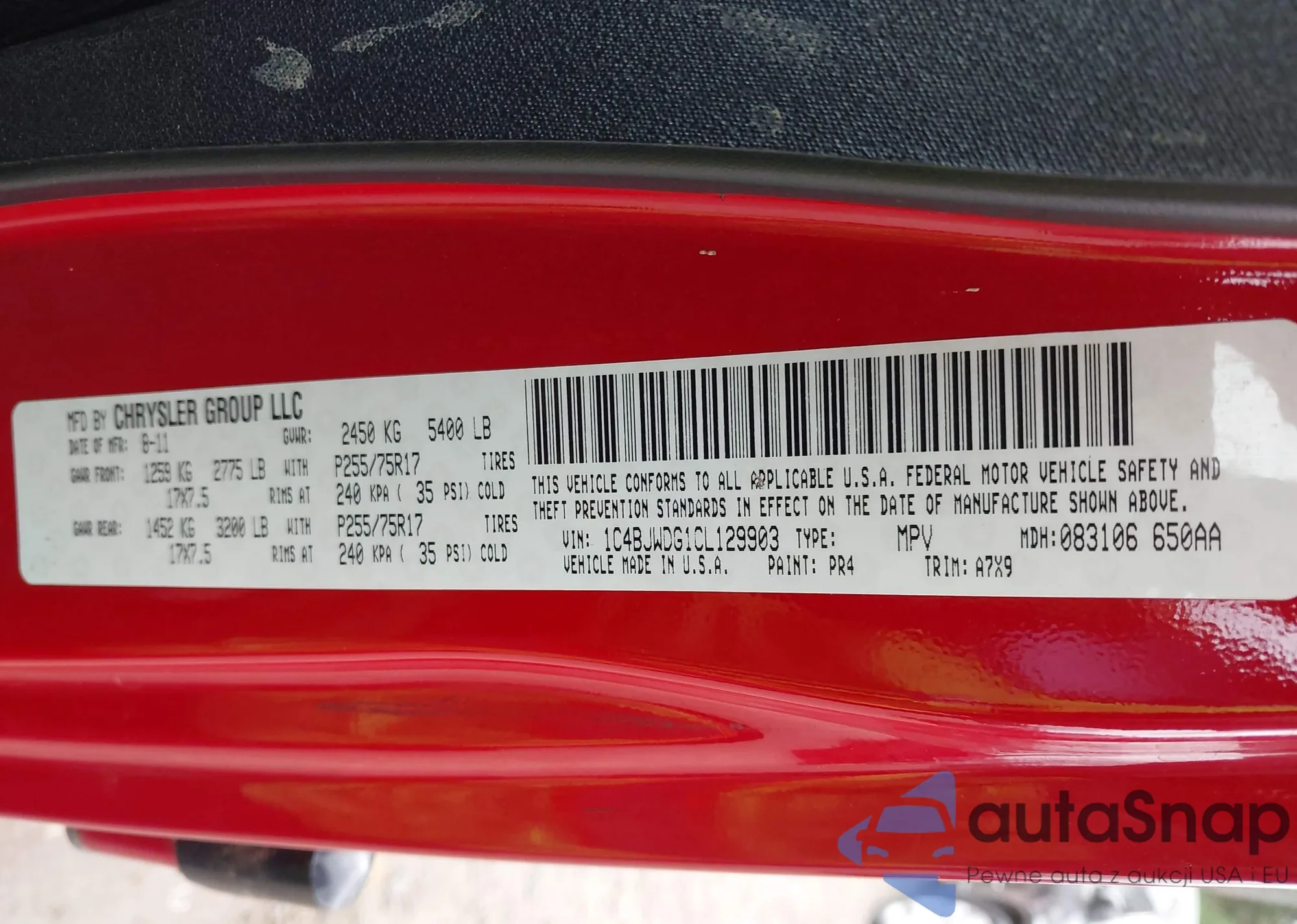 The car Jeep Wrangler 2012 (VIN 1C4BJWDG1CL129903) has not been auctioned before. The documents are clean, and the mileage matches or is below the market average. Sold by an insurance company – we recommend purchase. Delivery to the port will take approx. 6–8 weeks.