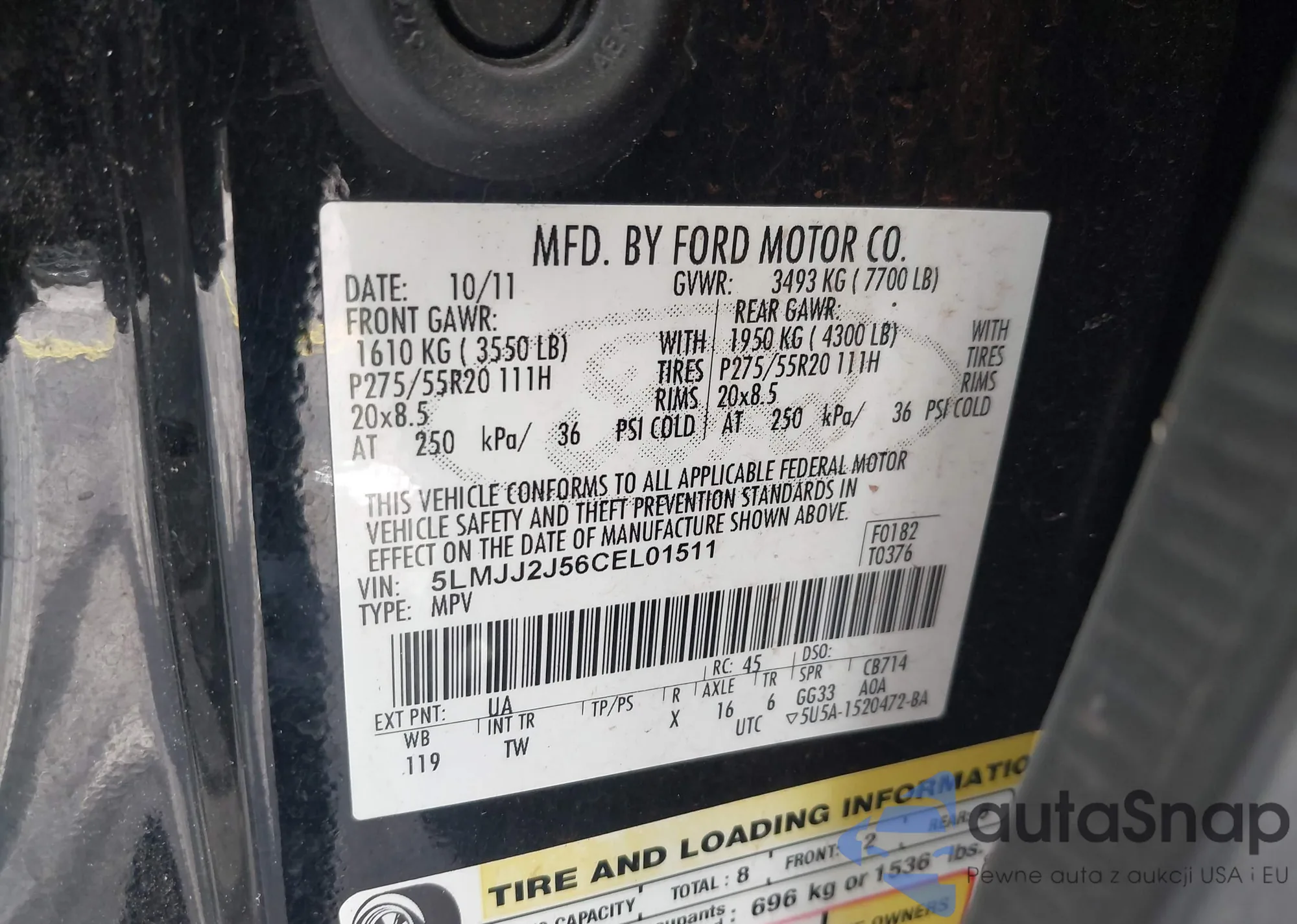 The car Lincoln Navigator 2012 (VIN 5LMJJ2J56CEL01511) has documents that prevent registration. Export and registration may be difficult. Contact AutaSnap experts to find alternatives.
