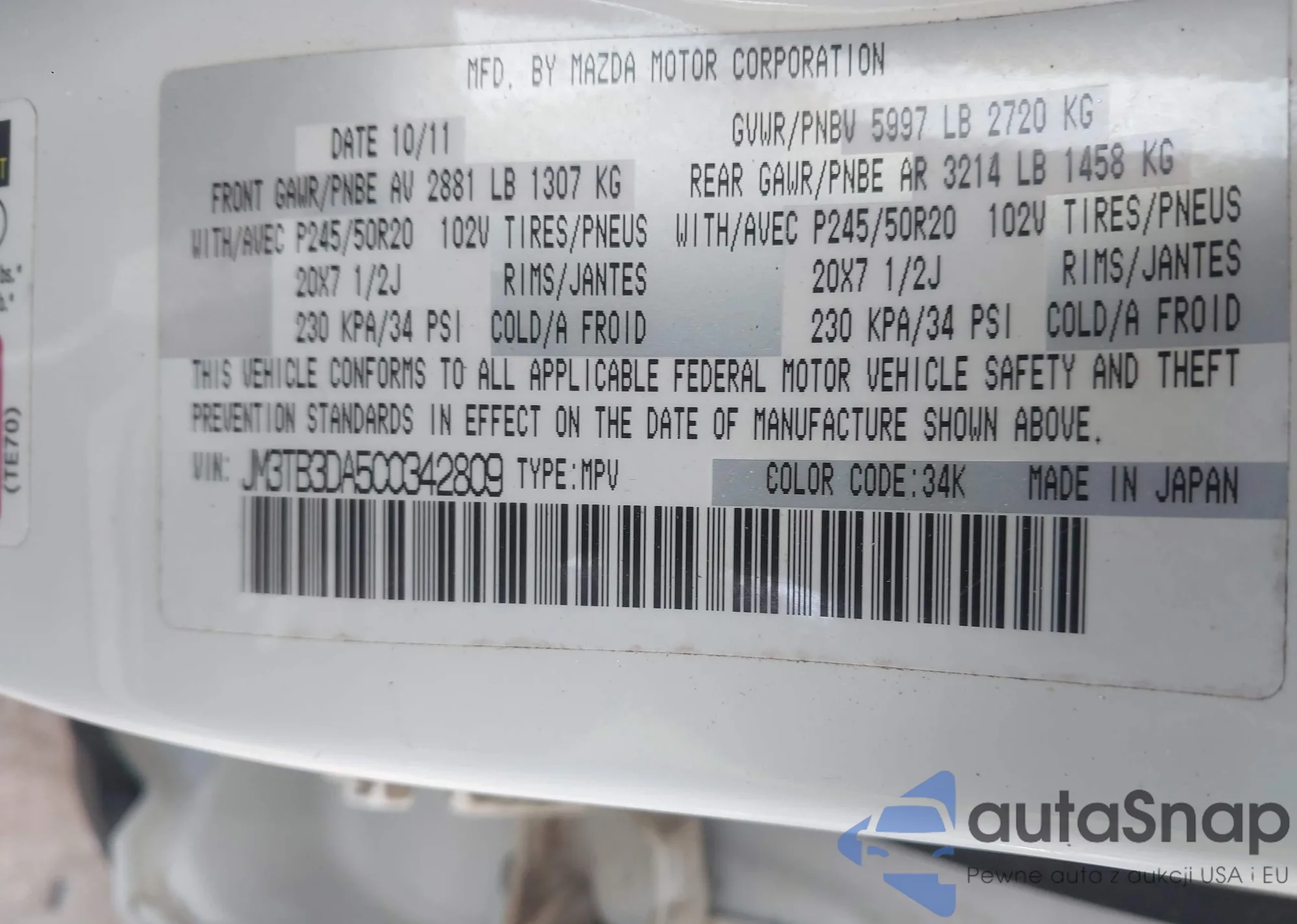 The car Mazda CX-9 2012 (VIN JM3TB3DA5C0342809) has not been auctioned before. The documents are clean, and the mileage matches or is below the market average. Sold by an insurance company – we recommend purchase. Delivery to the port will take approx. 6–8 weeks.