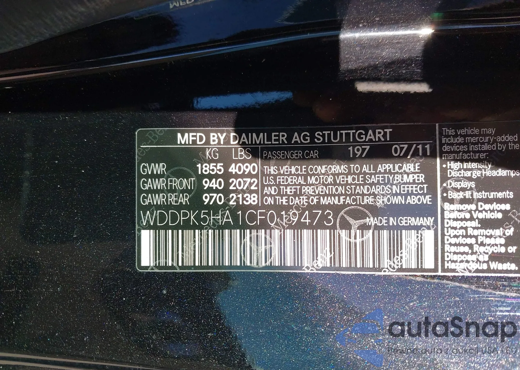 The car Mercedes-Benz SLK-klasse 2012 (VIN WDDPK5HA1CF019473) has documents that prevent registration. Export and registration may be difficult. Contact AutaSnap experts to find alternatives.