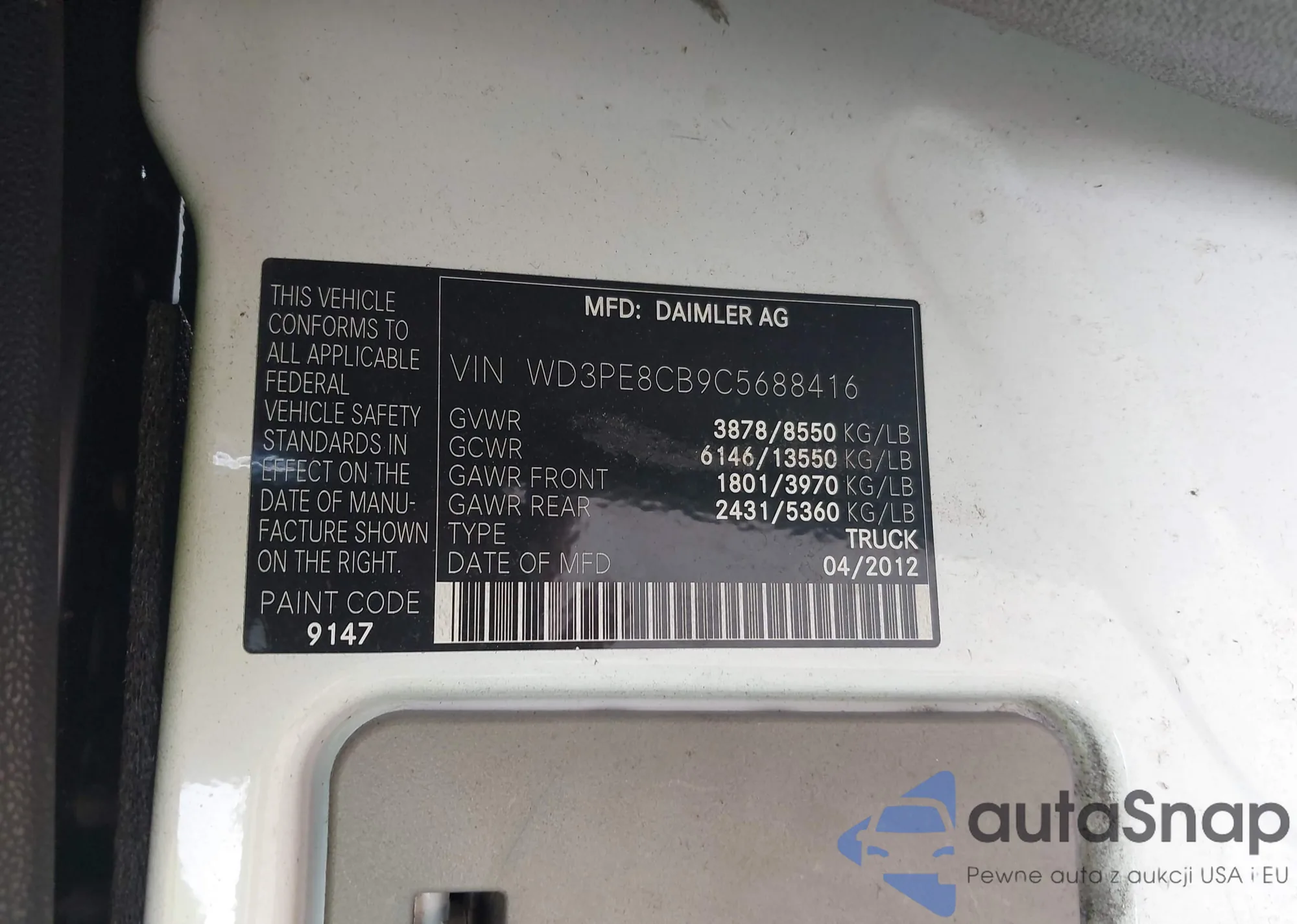 The car Mercedes-Benz Sprinter 2012 (VIN WD3PE8CB9C5688416) is sold by an unverified seller. We recommend checking the Carfax report and confirming registration possibilities before purchase.