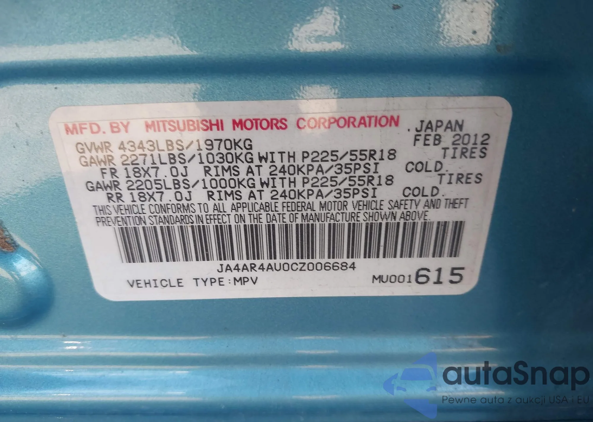 The car Mitsubishi Outlander 2012 (VIN JA4AR4AU0CZ006684) has not been auctioned before. The documents are clean, and the mileage matches or is below the market average. Sold by an insurance company – we recommend purchase. Delivery to the port will take approx. 6–8 weeks.