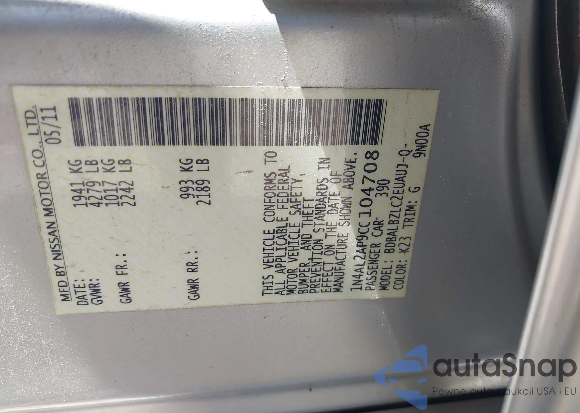• VIN: 1N4AL2AP9CC104708