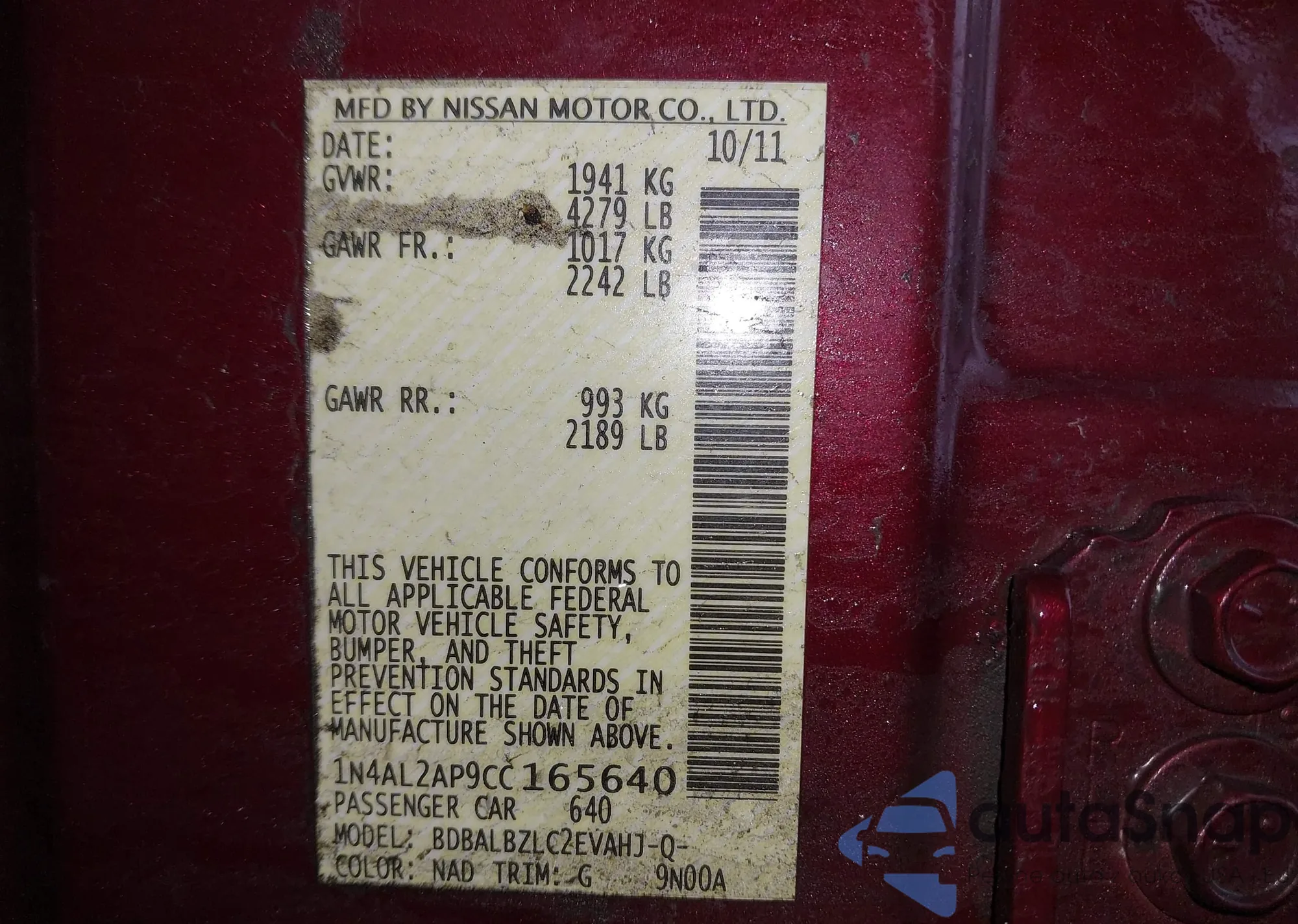 VIN: 1N4AL2AP9CC165640