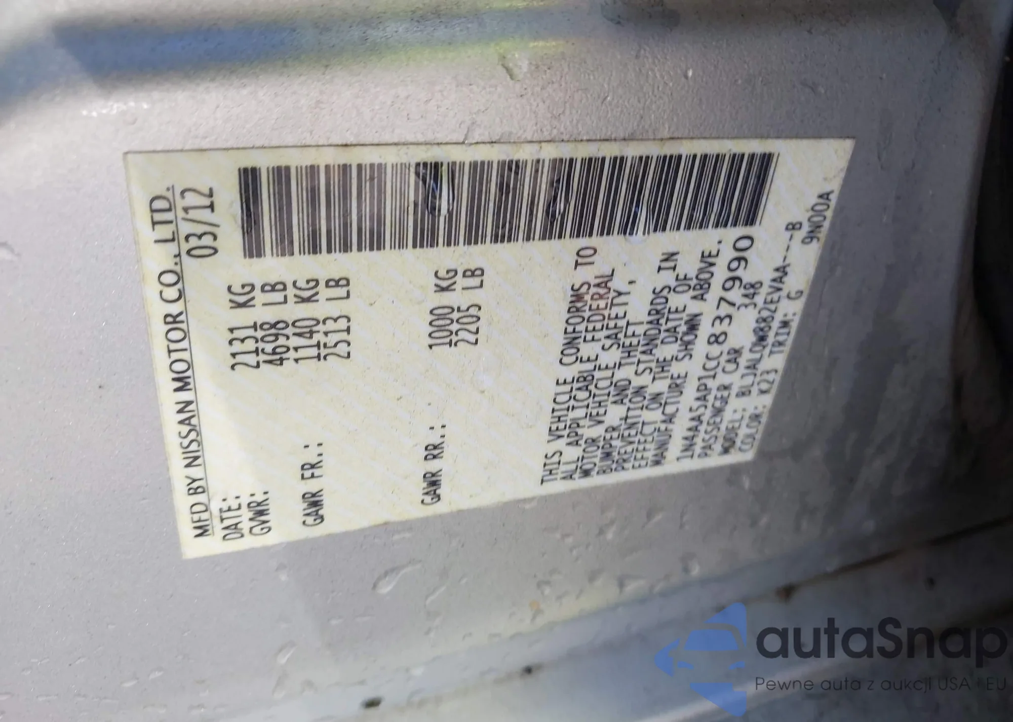 The car Nissan Maxima 2012 (VIN 1N4AA5AP1CC837990) has not been auctioned before. The documents are clean, and the mileage matches or is below the market average. Sold by an insurance company – we recommend purchase. Delivery to the port will take approx. 6–8 weeks.