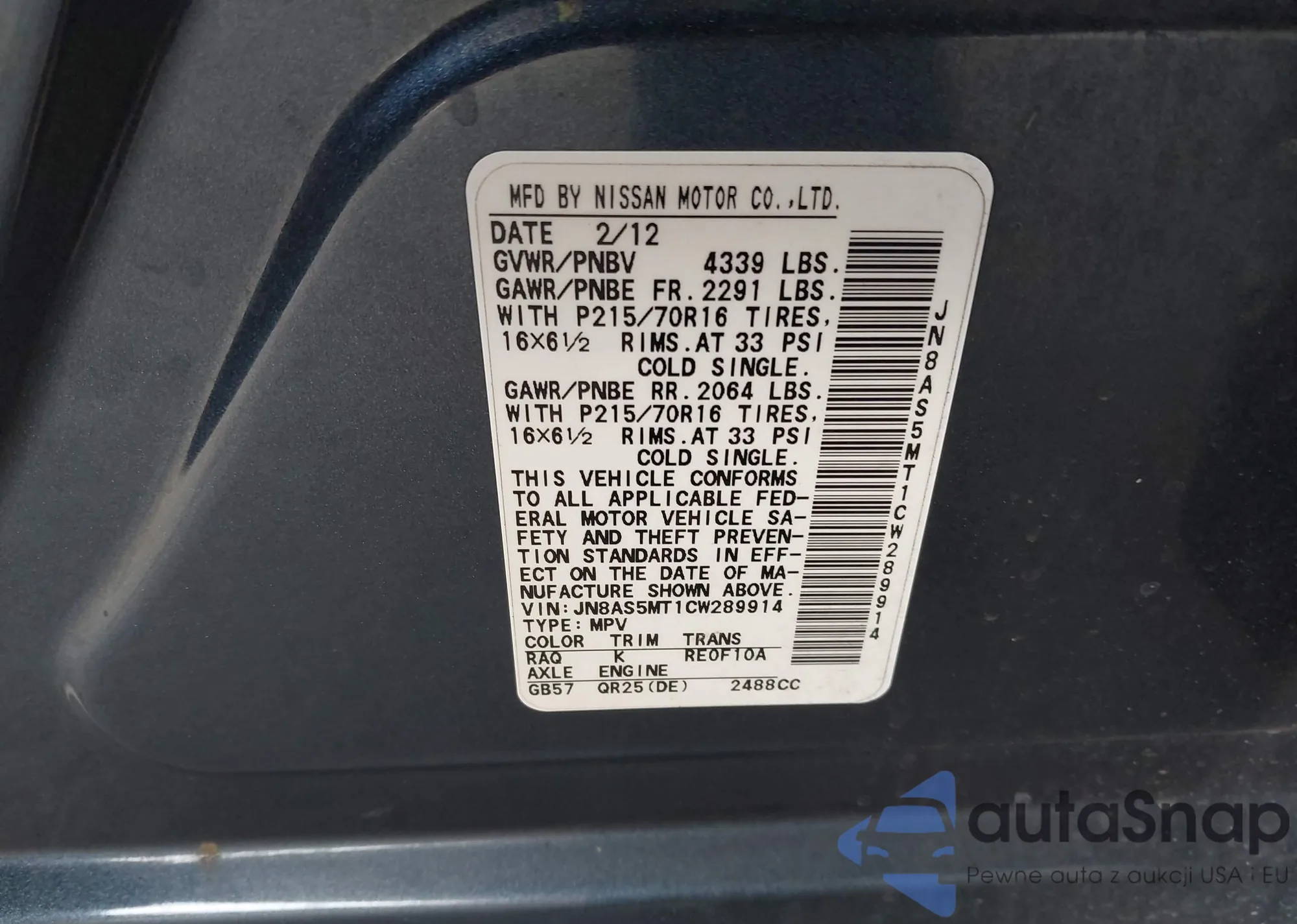 The car Nissan Rogue 2012 (VIN JN8AS5MT1CW289914) has not been auctioned before. The documents are clean, and the mileage matches or is below the market average. Sold by an insurance company – we recommend purchase. Delivery to the port will take approx. 6–8 weeks.