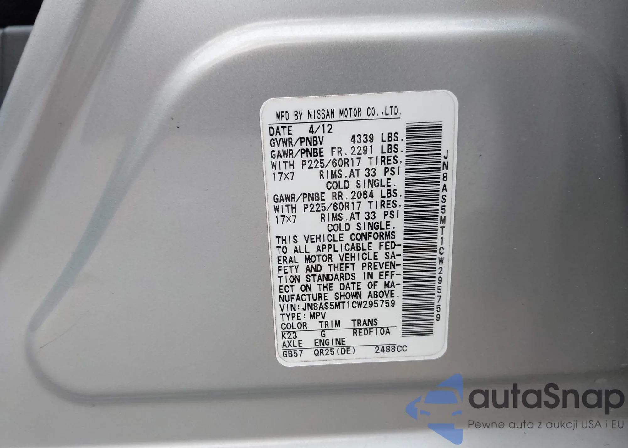 • VIN: JN8AS5MT1CW295759