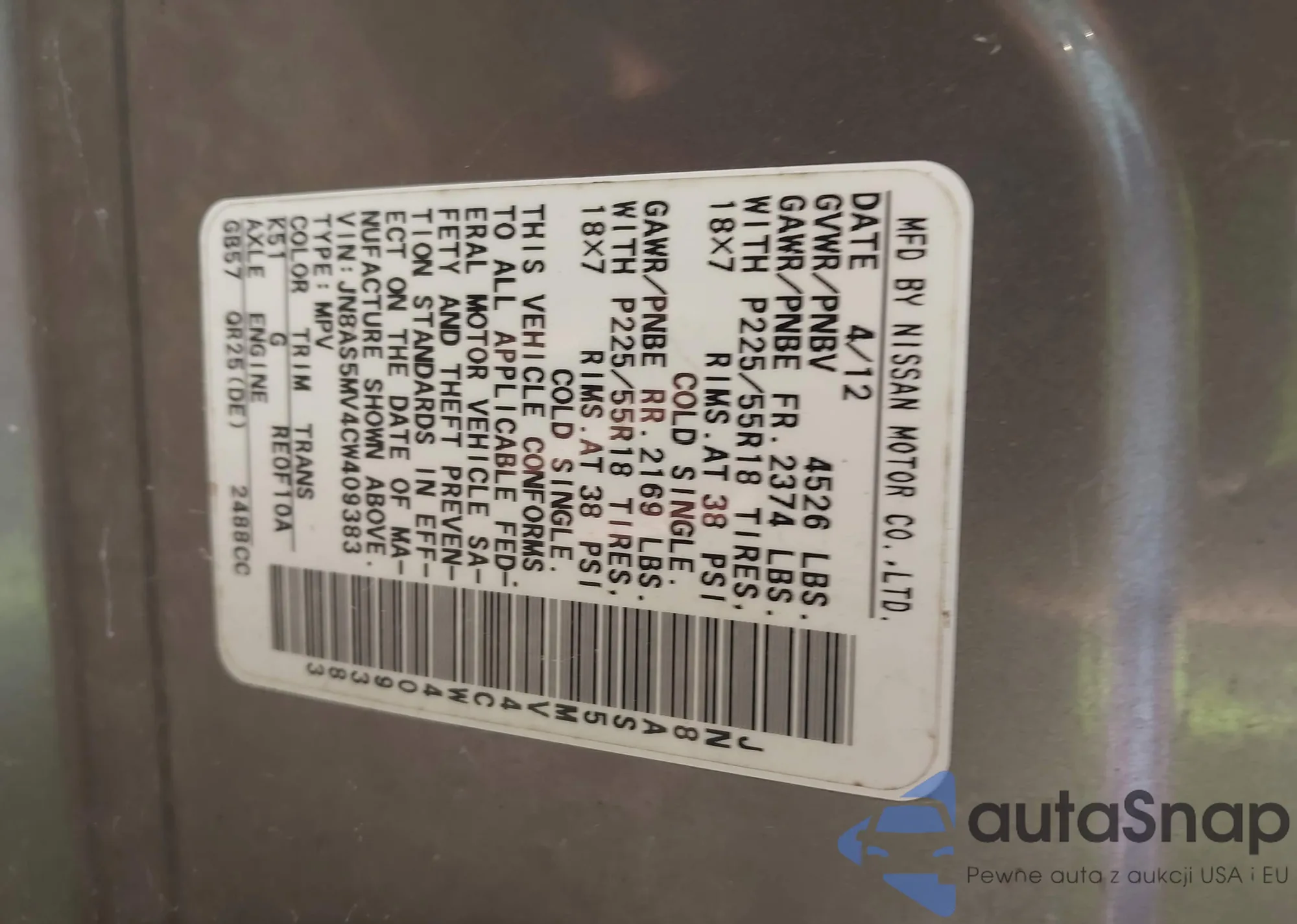 VIN: JN8AS5MV4CW409383