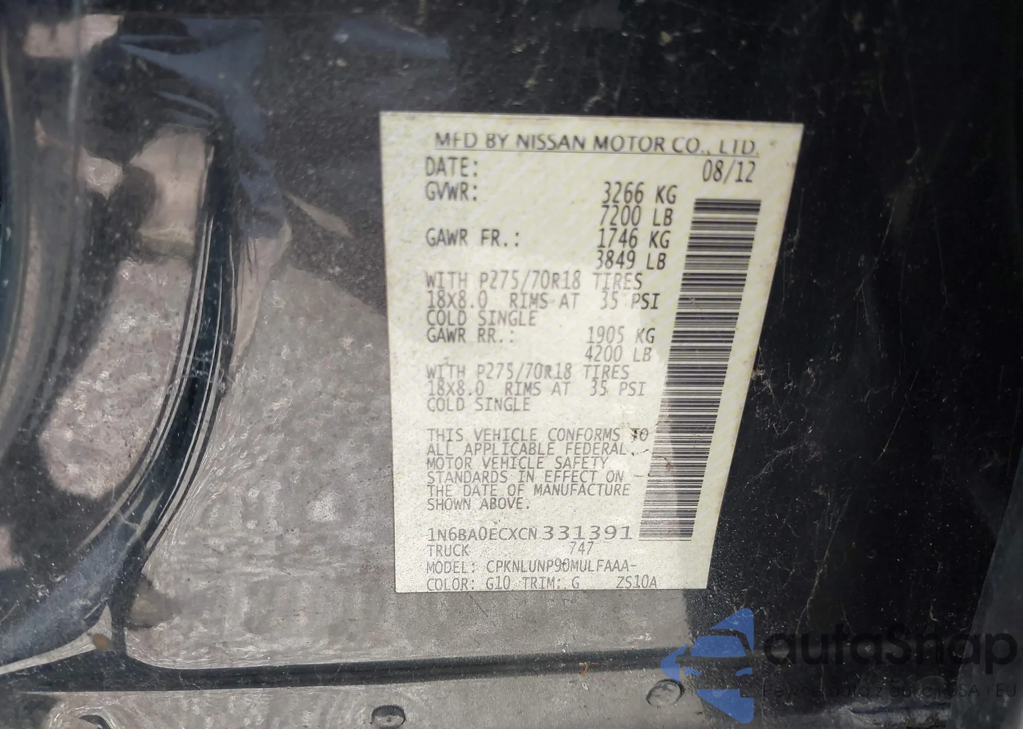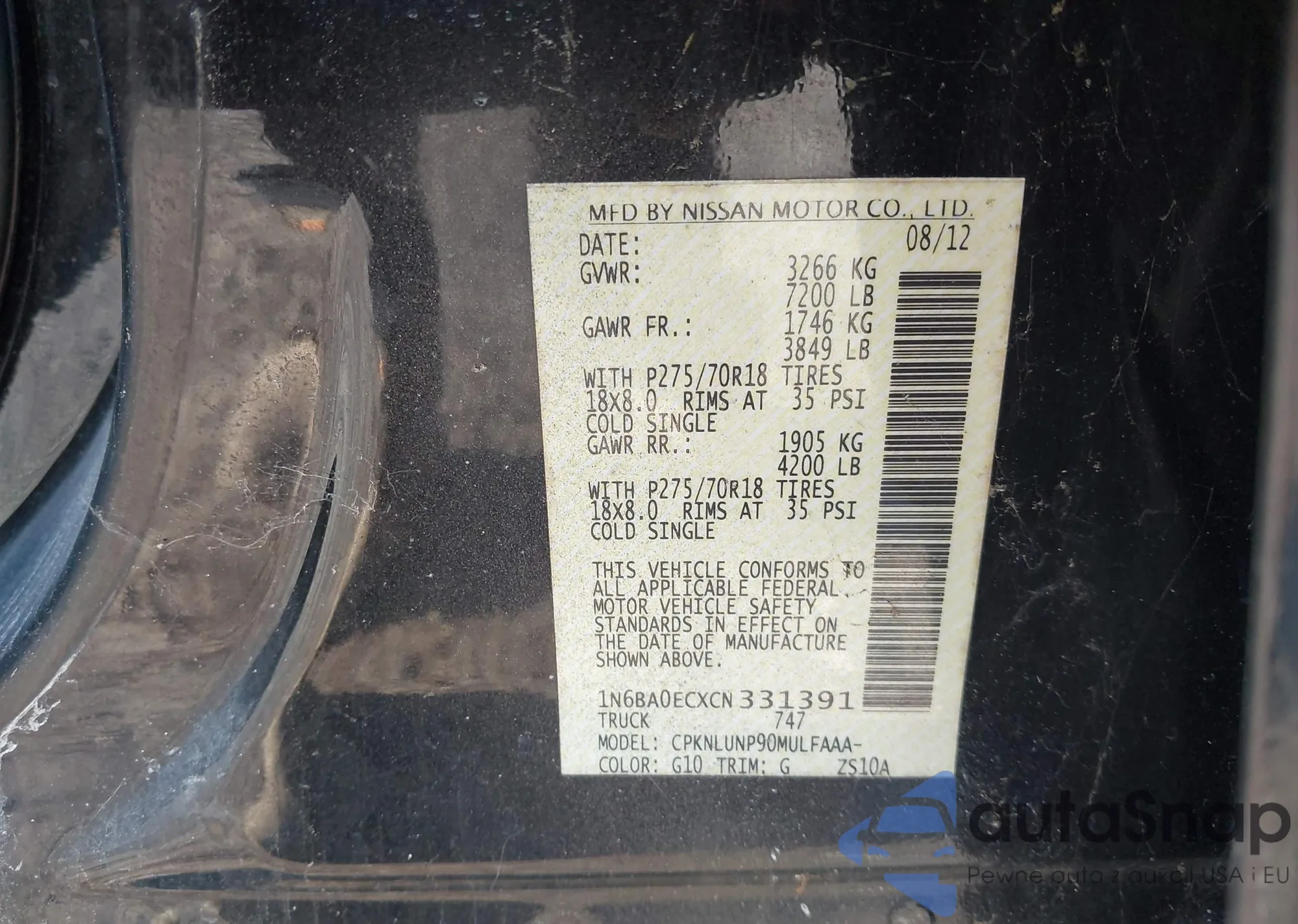 The car Nissan Titan 2012 (VIN 1N6BA0ECXCN331391) has documents that prevent registration. Export and registration may be difficult. Contact AutaSnap experts to find alternatives.