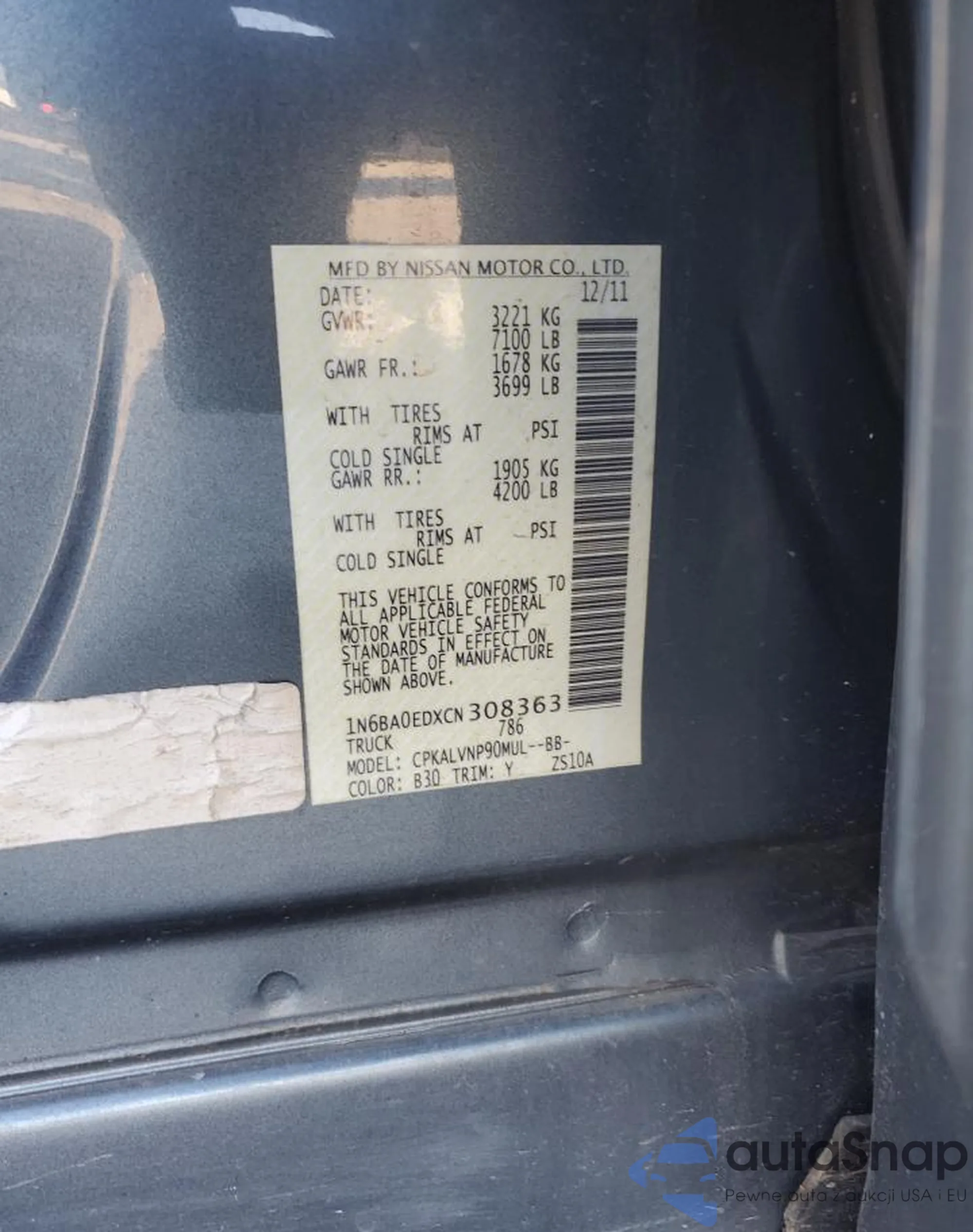 The car Nissan Titan 2012 (VIN 1N6BA0EDXCN308363) has not been auctioned before. The documents are clean, and the mileage matches or is below the market average. Sold by an insurance company – we recommend purchase. Delivery to the port will take approx. 6–8 weeks.