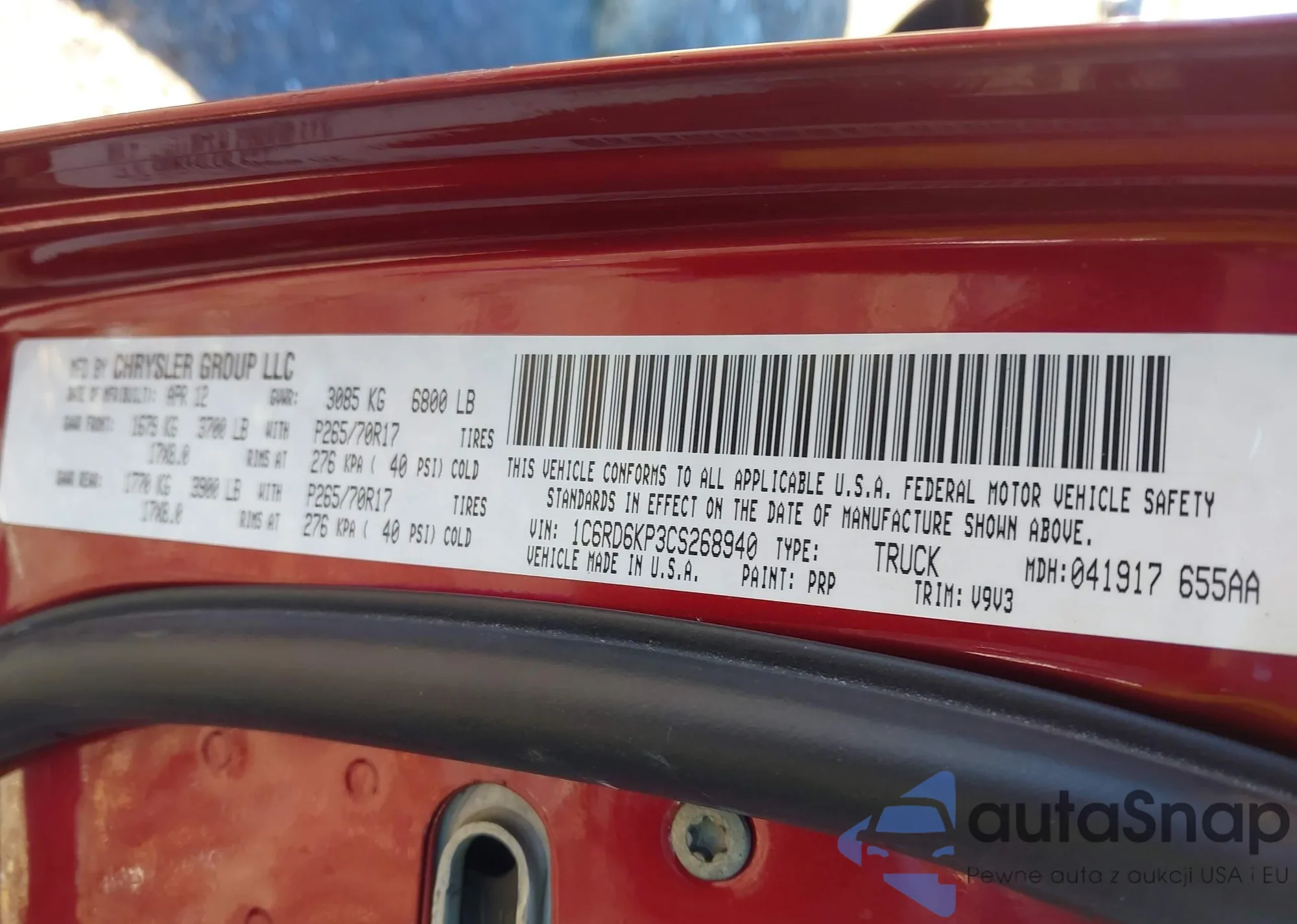 The car RAM 1500 2012 (VIN 1C6RD6KP3CS268940) has not been auctioned before. The documents are clean, and the mileage matches or is below the market average. Sold by an insurance company – we recommend purchase. Delivery to the port will take approx. 6–8 weeks.