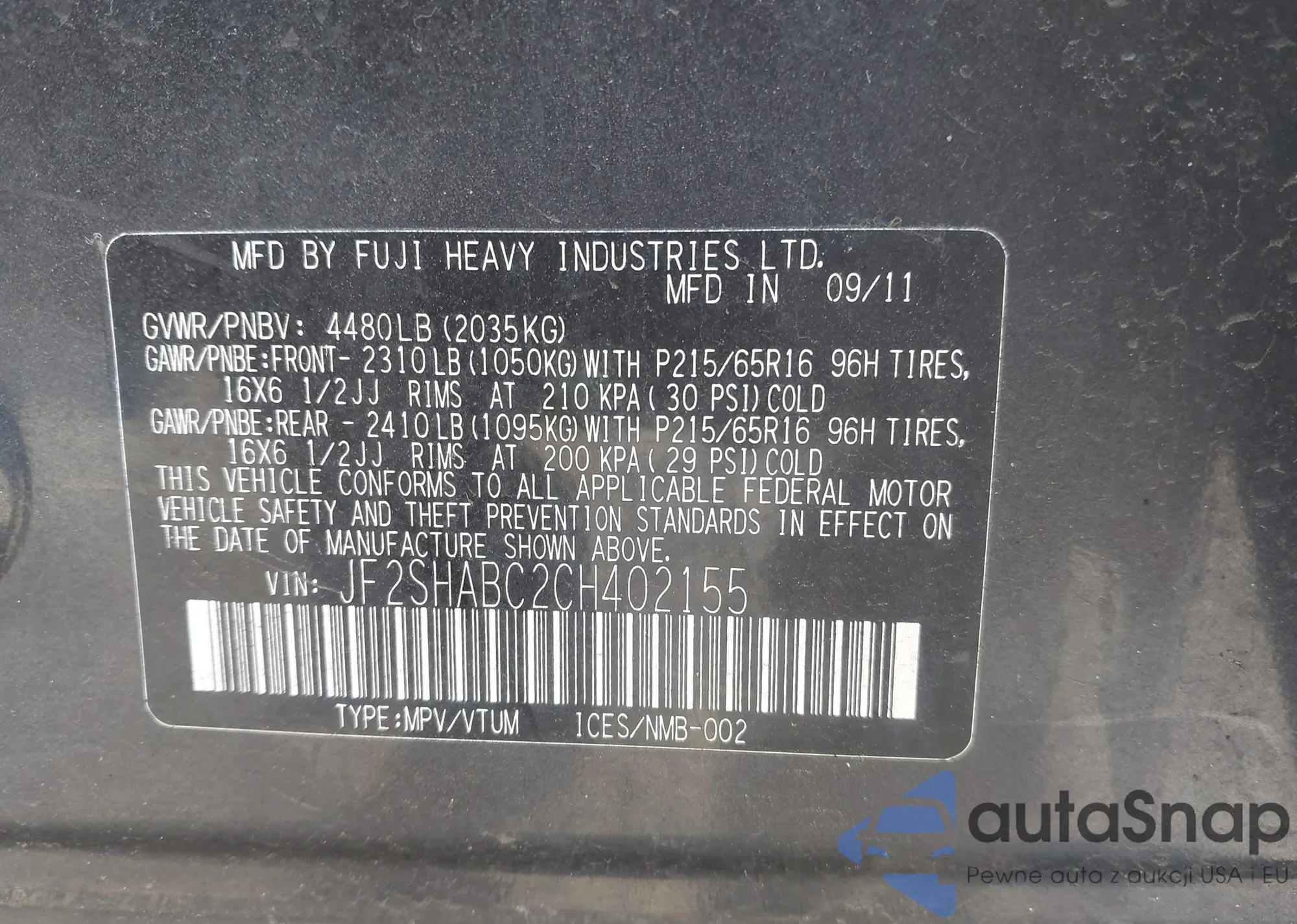The car Subaru Forester 2012 (VIN JF2SHABC2CH402155) has not been auctioned before. The documents are clean, and the mileage matches or is below the market average. Sold by an insurance company – we recommend purchase. Delivery to the port will take approx. 6–8 weeks.