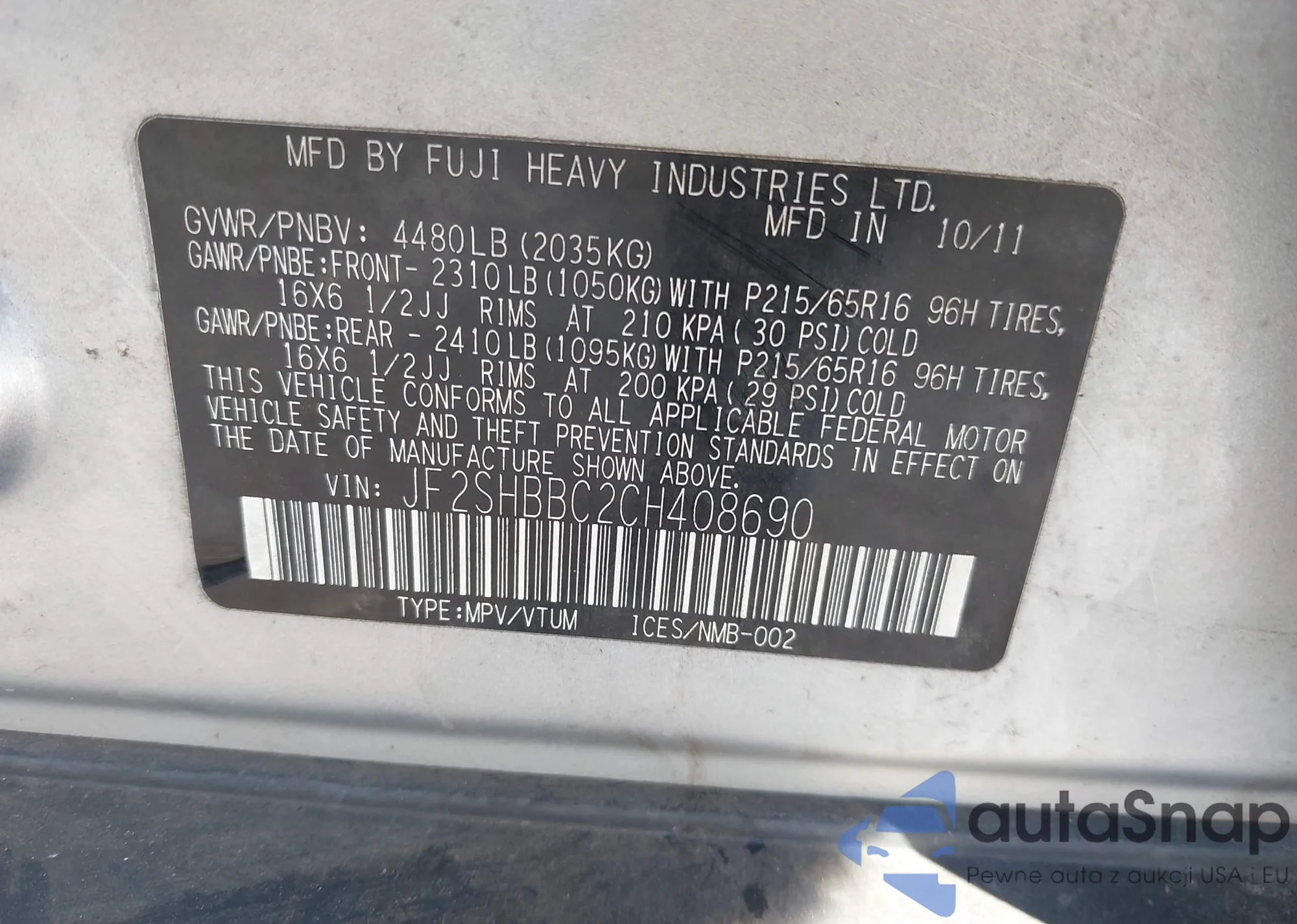 The car Subaru Forester 2012 (VIN JF2SHBBC2CH408690) has already been auctioned 1 times and/or is sold by an unverified seller. We recommend checking the Carfax report and confirming registration possibilities before purchase.