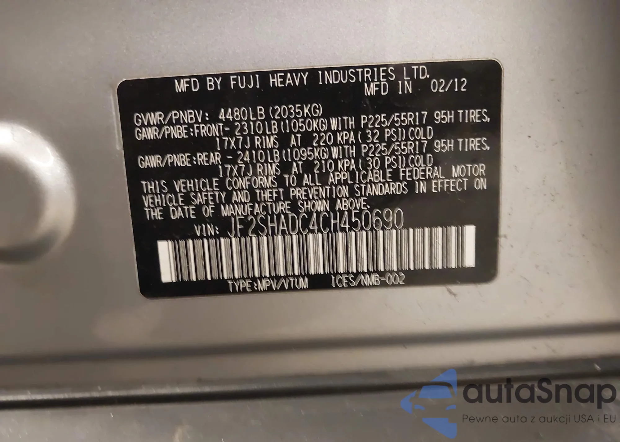The car Subaru Forester 2012 (VIN JF2SHADC4CH450690) has already been auctioned 1 times and/or is sold by an unverified seller. We recommend checking the Carfax report and confirming registration possibilities before purchase.