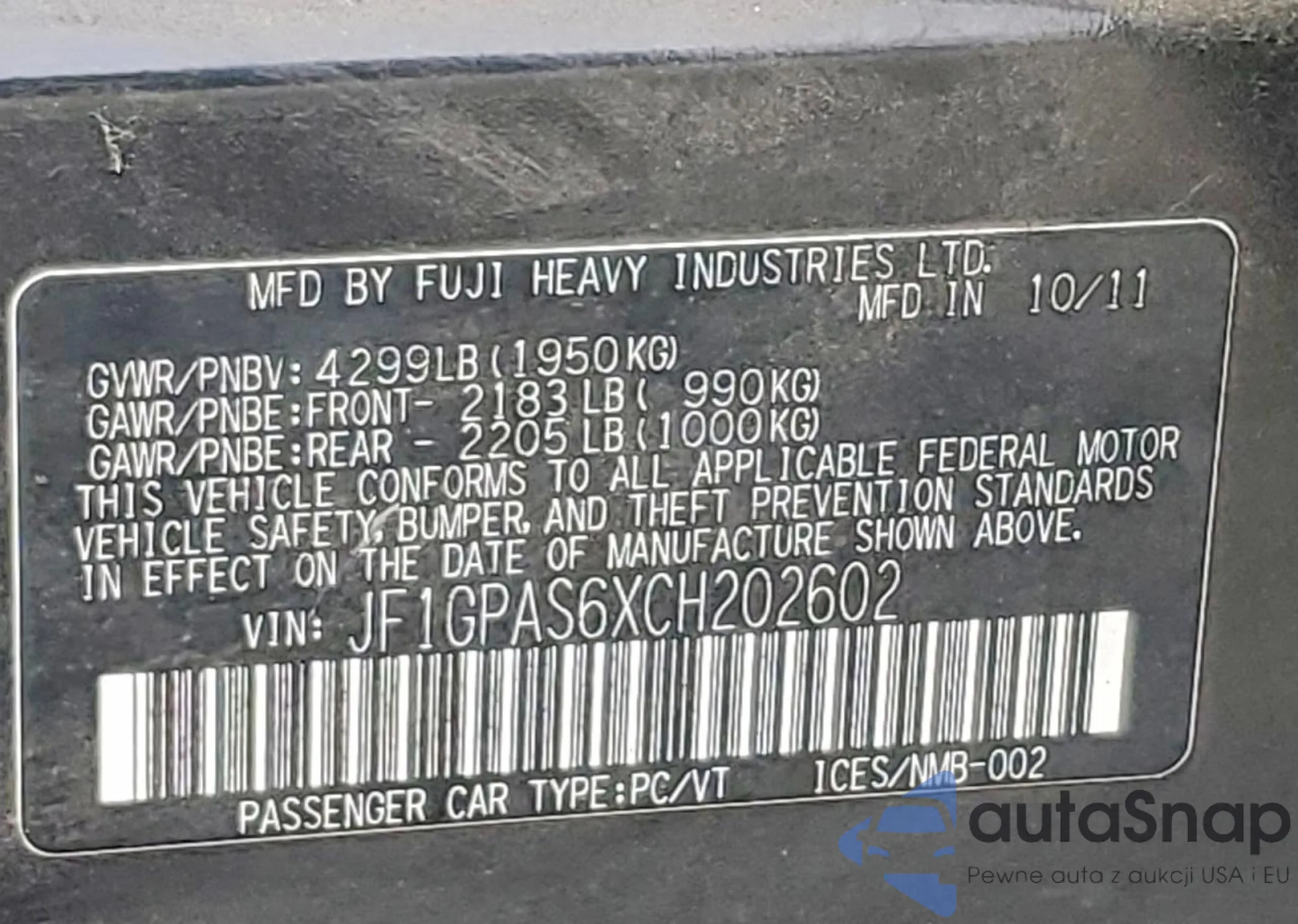 The car Subaru Impreza 2012 (VIN JF1GPAS6XCH202602) has not been auctioned before. The documents are clean, and the mileage matches or is below the market average. Sold by an insurance company – we recommend purchase. Delivery to the port will take approx. 6–8 weeks.