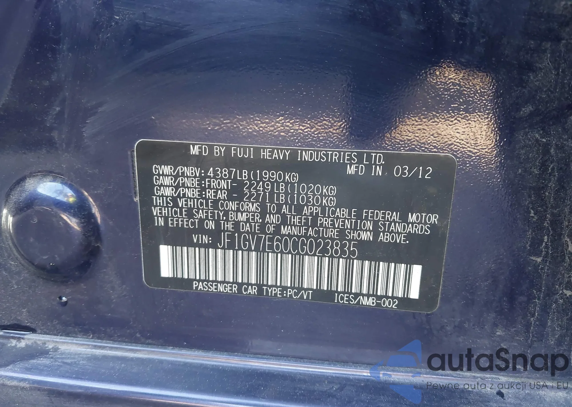 The car Subaru Impreza 2012 (VIN JF1GV7E60CG023835) has not been auctioned before. The documents are clean, and the mileage matches or is below the market average. Sold by an insurance company – we recommend purchase. Delivery to the port will take approx. 6–8 weeks.